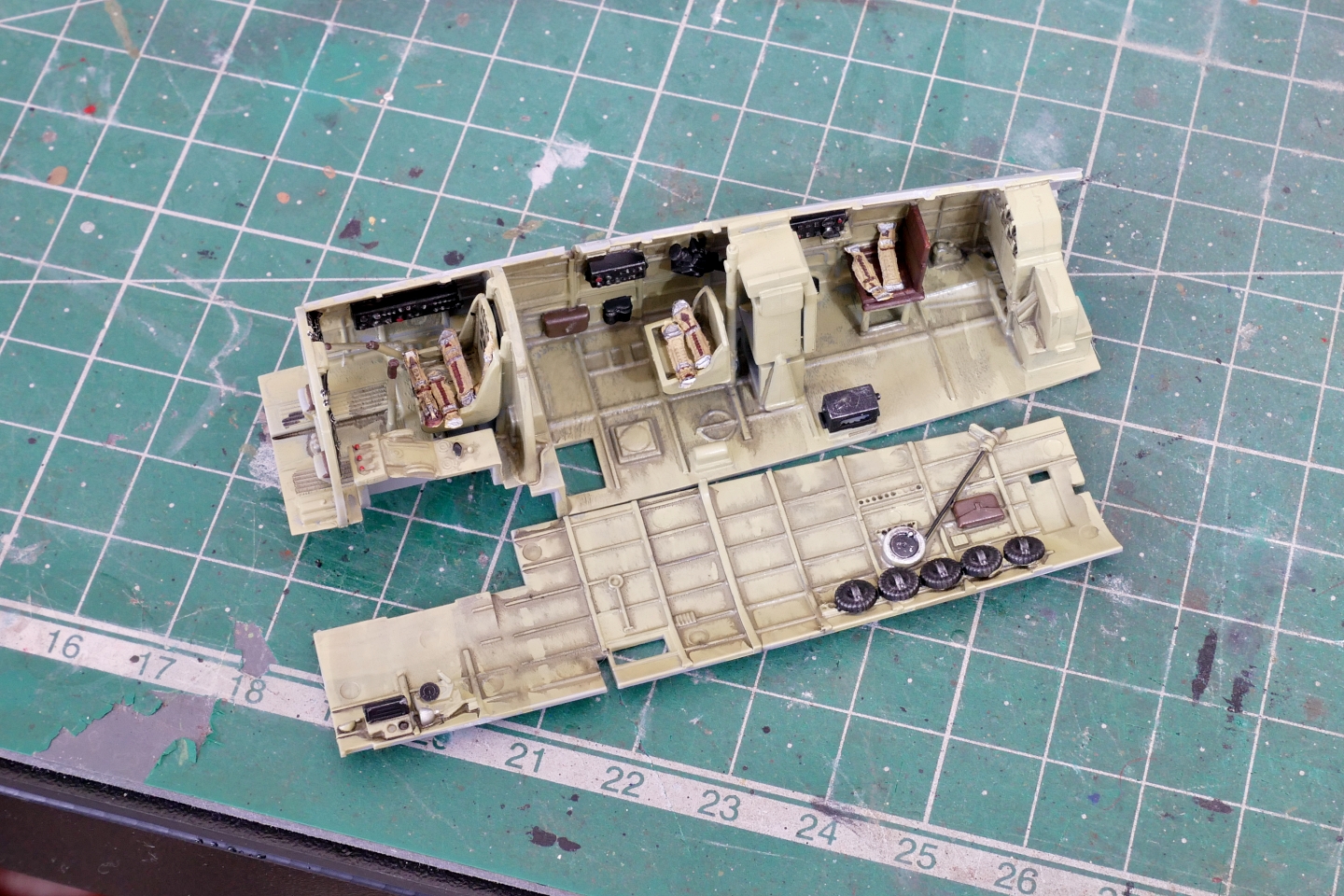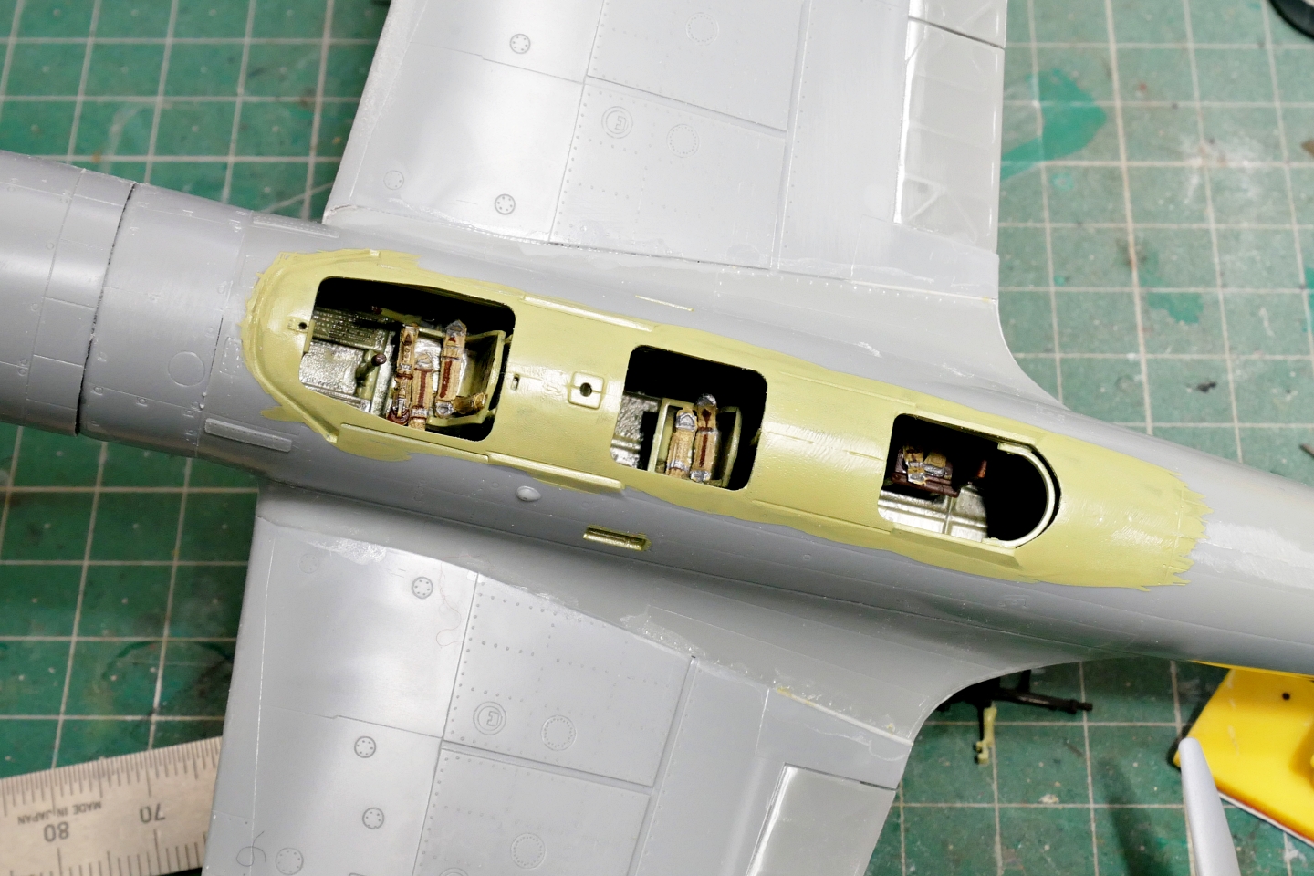 内側は機体内部色なので最初に塗装しておきました。それと、操縦席と爆撃手の間にもしきいがあるので忘れないうちに塗装しておきます。