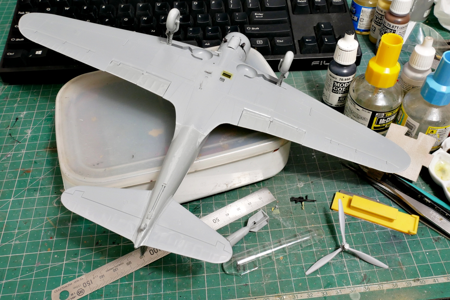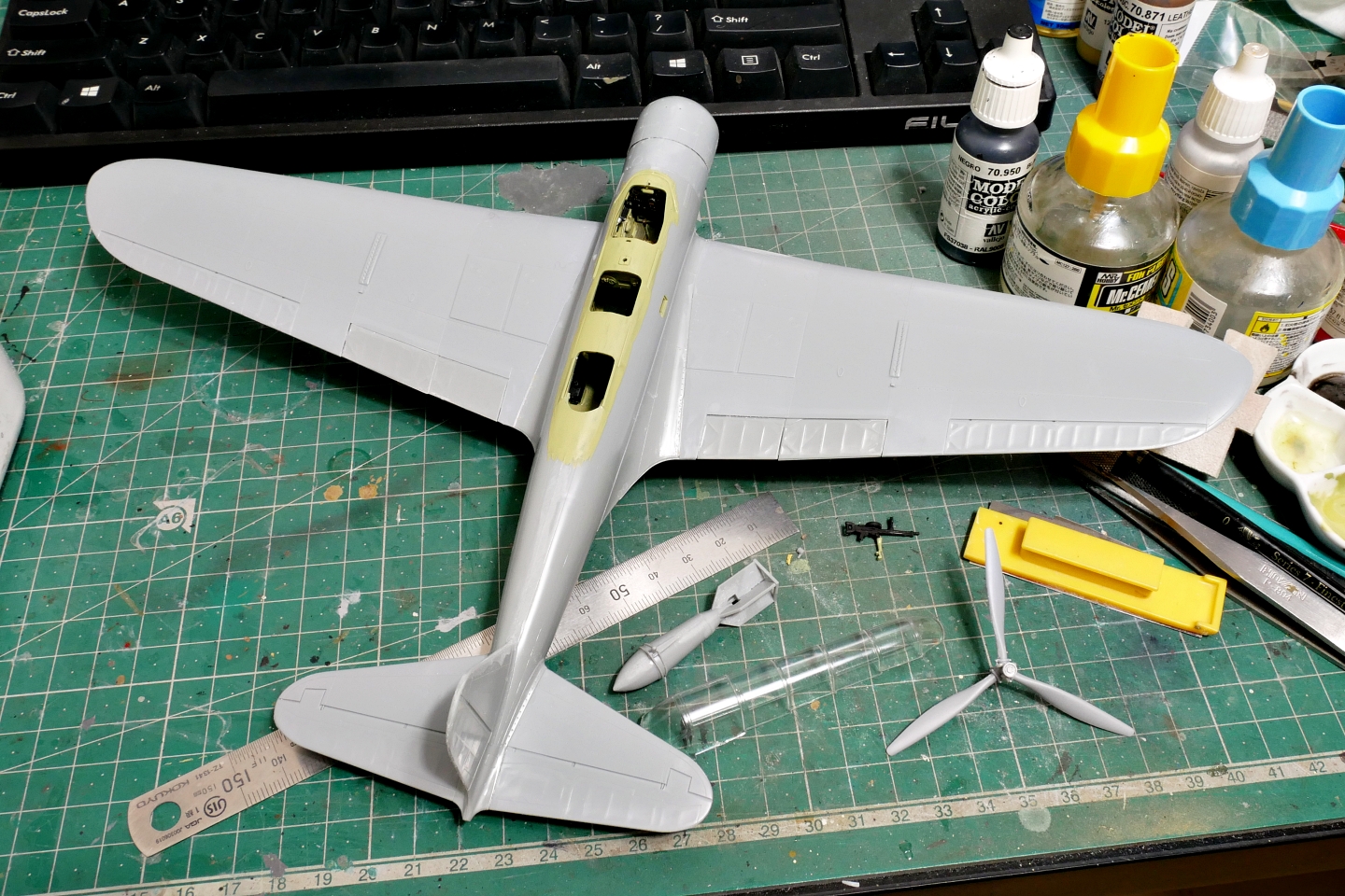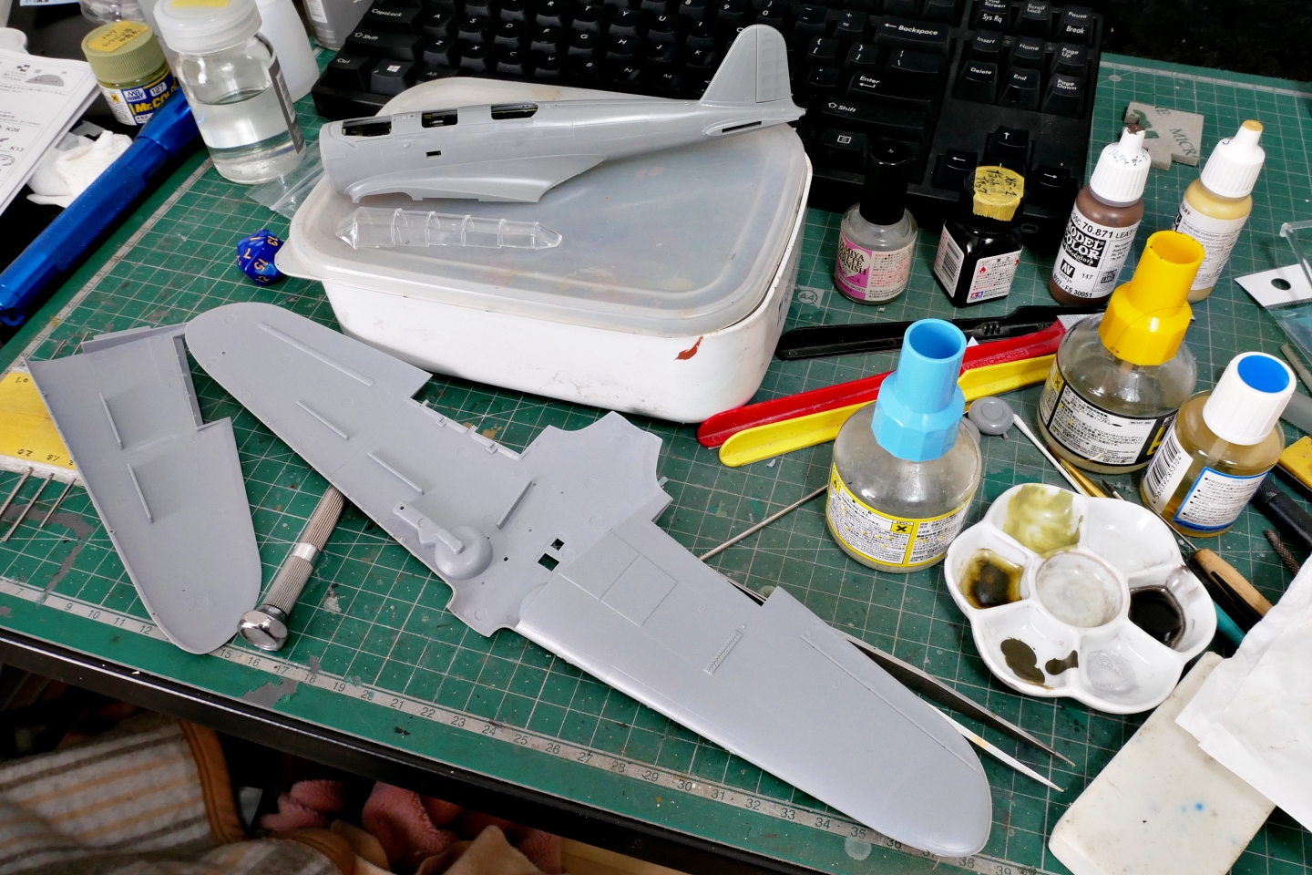コックピットモジュールがちゃんと機体下部に干渉しないで格納されるのか心配だったので、機体左右の貼り合わせと主翼の接着の前に一通り仮組みしようと、いろいろ準備しているところ。