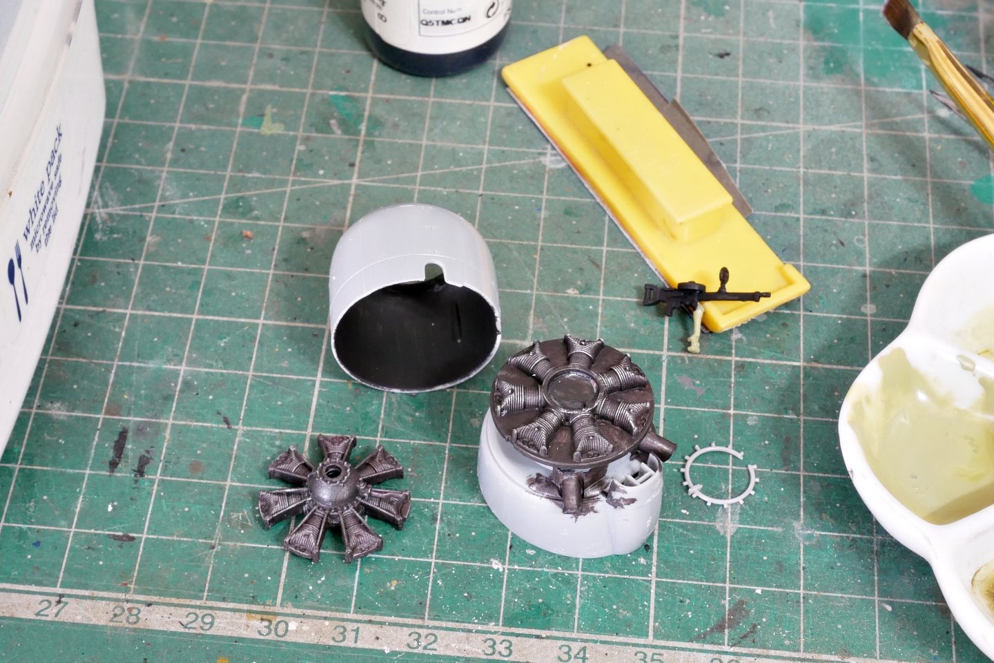 エンジン部分を塗装中です。そんなに作り込まないけどいちおうは凹凸部分を際立たせるためにシルバーでドライブラシしておきました。プロペラの間からちらっと見えると思うので。