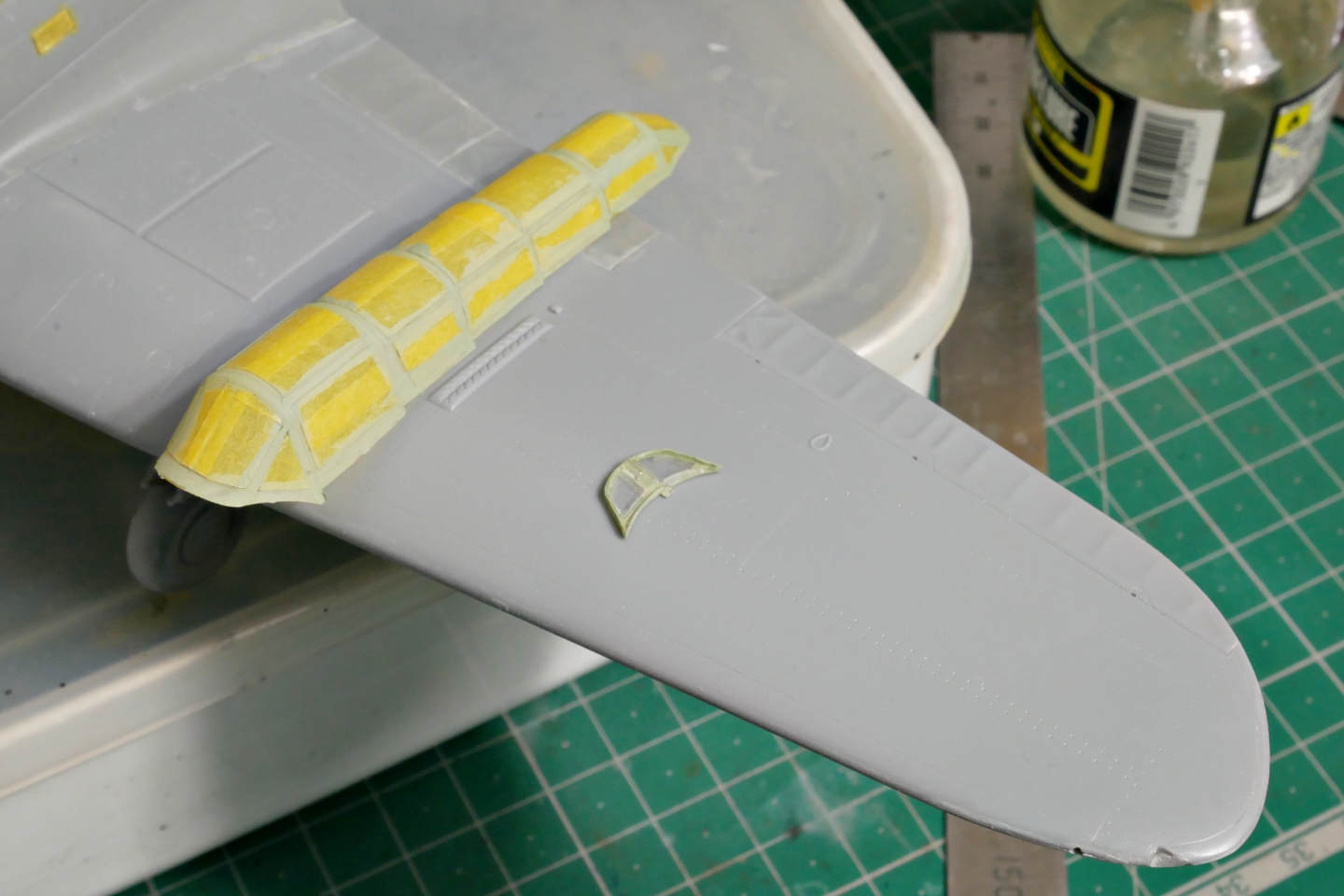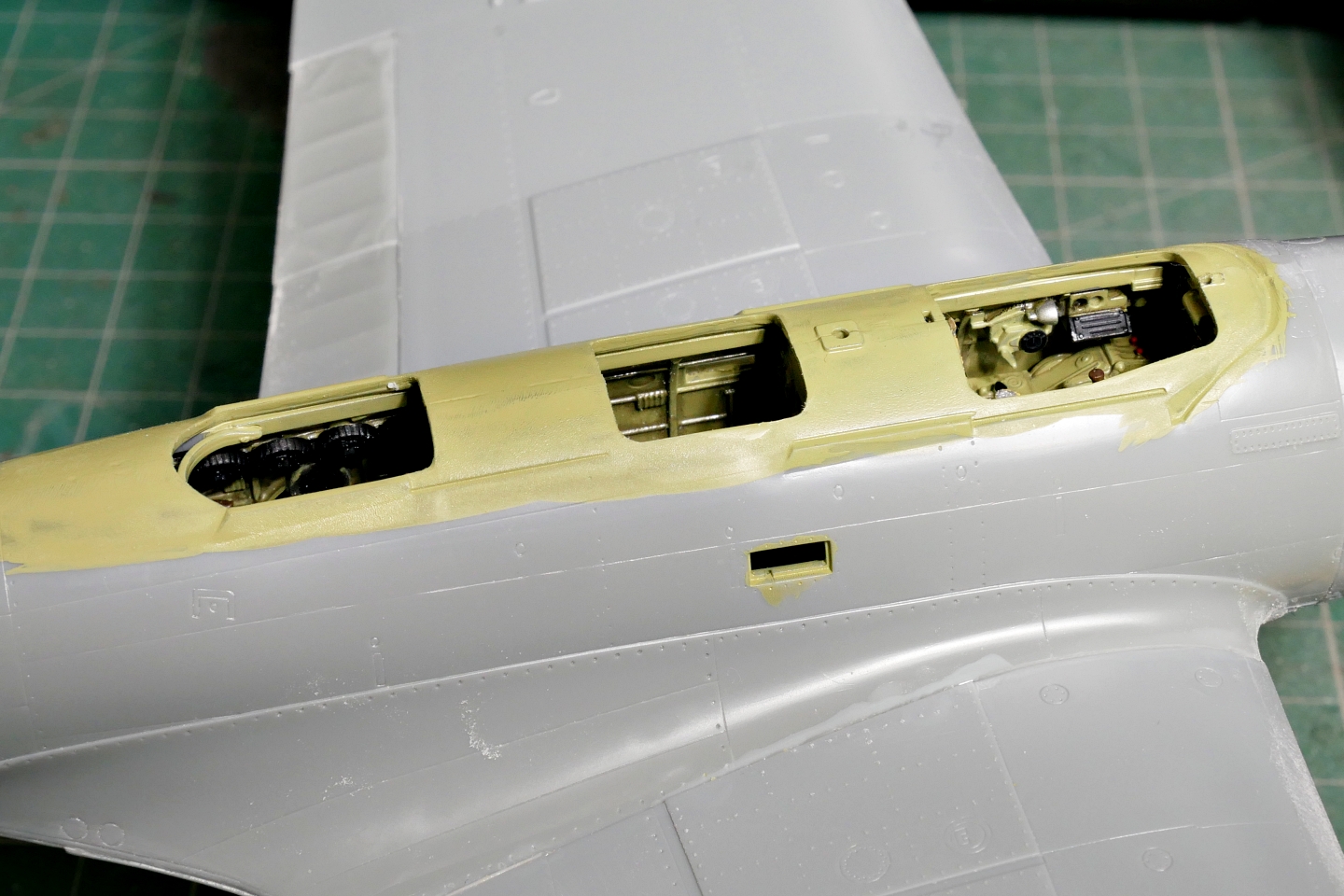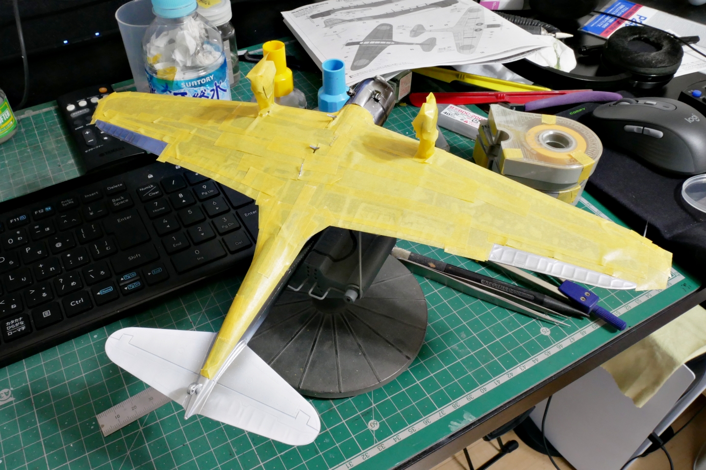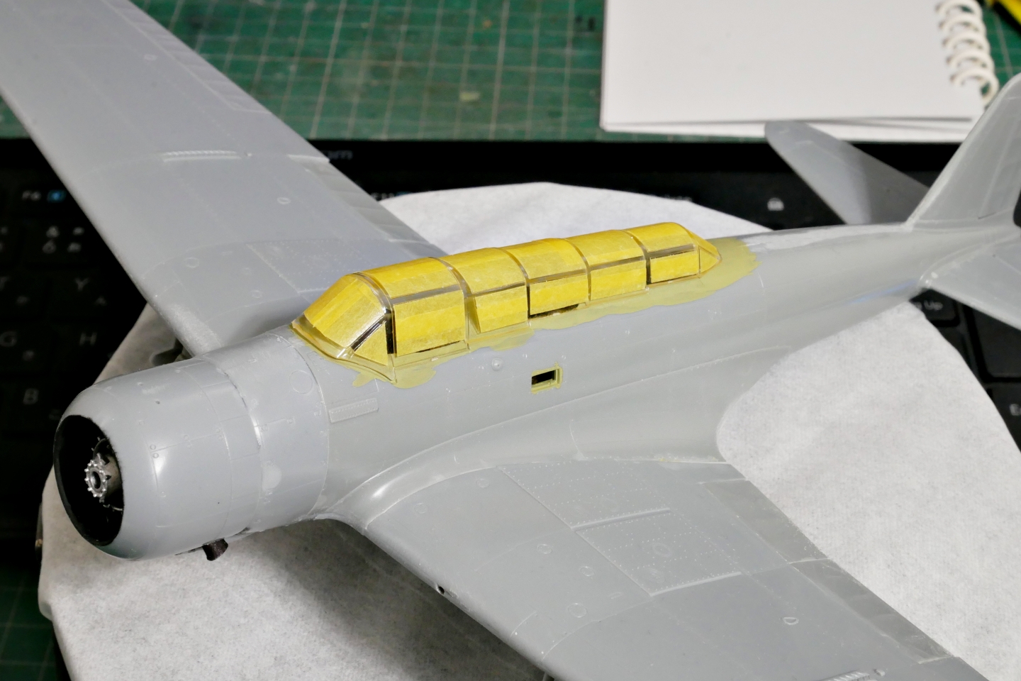 キャノピーをマスキングしました。3人乗りでキャノピーが長いしフレームも多いのでマスキング作業が細かいです。期待とキャノピーを合わせてみたらちょっと隙間ができる部分があるので、最終的に少しパテで埋めるかも。
