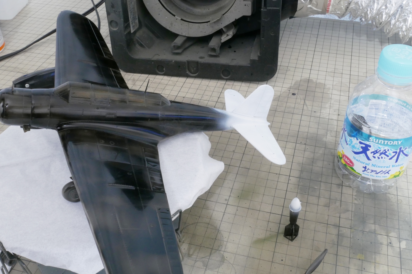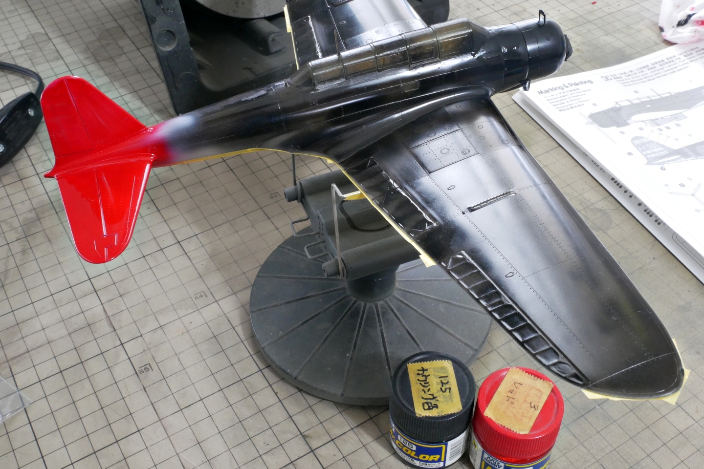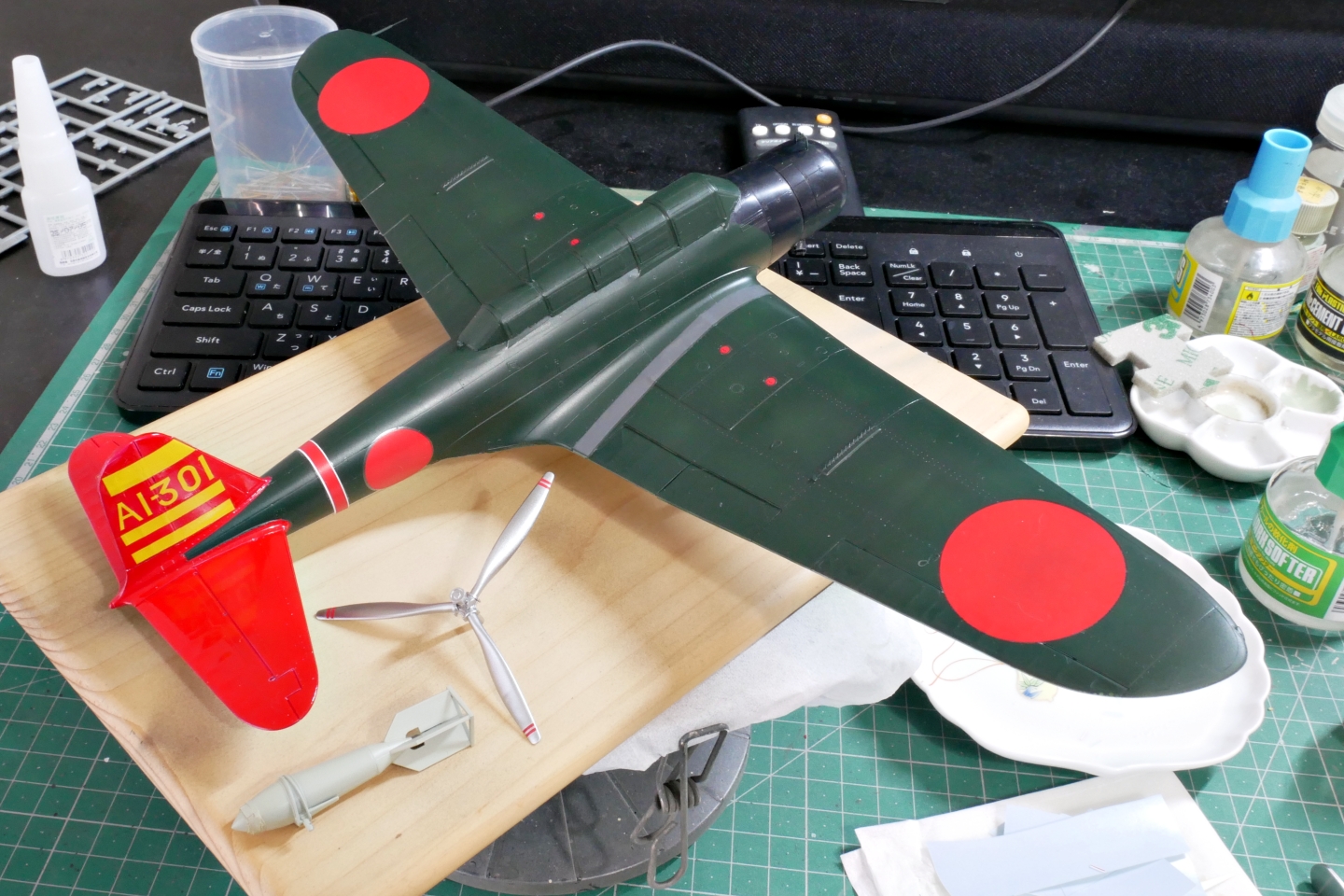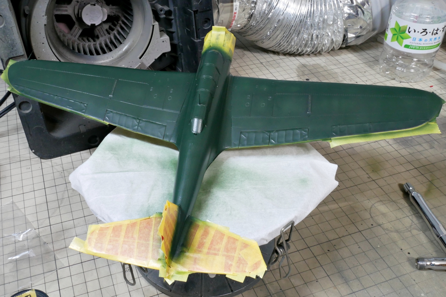 帝国海軍機らしく暗緑色を塗装したらエアブラシ作業はだいたい完了です。赤い部分をマスキングするときに、本当はこちらにも羽布張り部分があったのにマスキングするのを忘れちゃいました。あとで塗り分けしないといけません。あとはデカールを貼って少し細かいところを塗装すれば完成なのでもう一息。