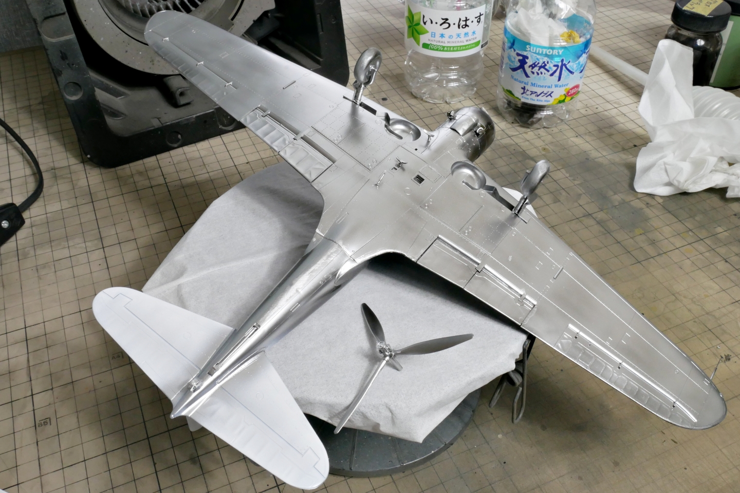 シルバーで機体下面を塗装しました。ここまではだいたいで良いんだけど、次の工程からはちゃんとマスキングしないと切れに塗り分けできないと思います。