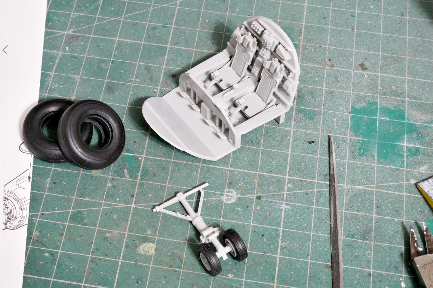 コックピットのシートは並列配置なんですね、さすがに大型機らしいです。よく見るとコックピット内のシートベルトは薄くモールドで再現されているようですがほとんど肉眼では見えないので、何か薄いベルト状のもので再現したほうがよりリアルになると思います。ランディングギアとかタイヤもけっこう大きい。