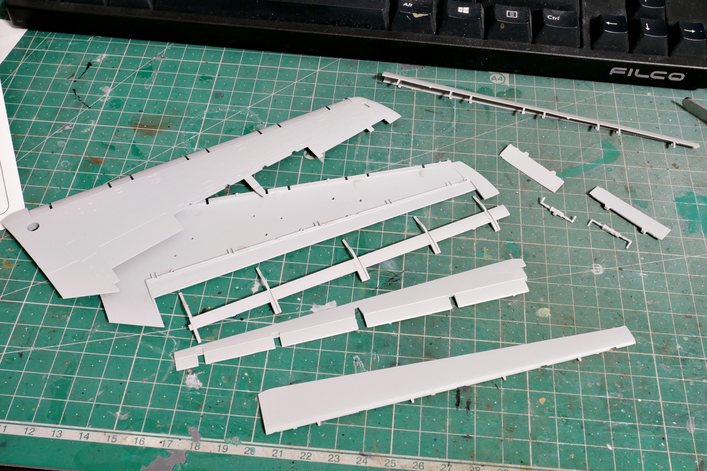 主翼を組み立て中です。けっこうな部品の数ですし、でかい。パーツの精度はけっこう良いと思いました。