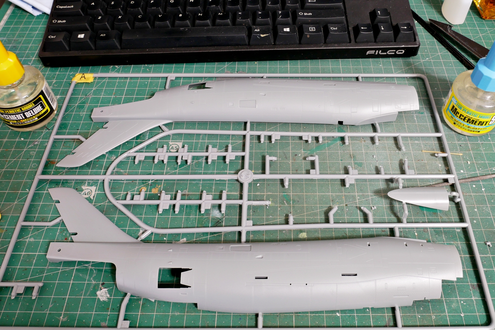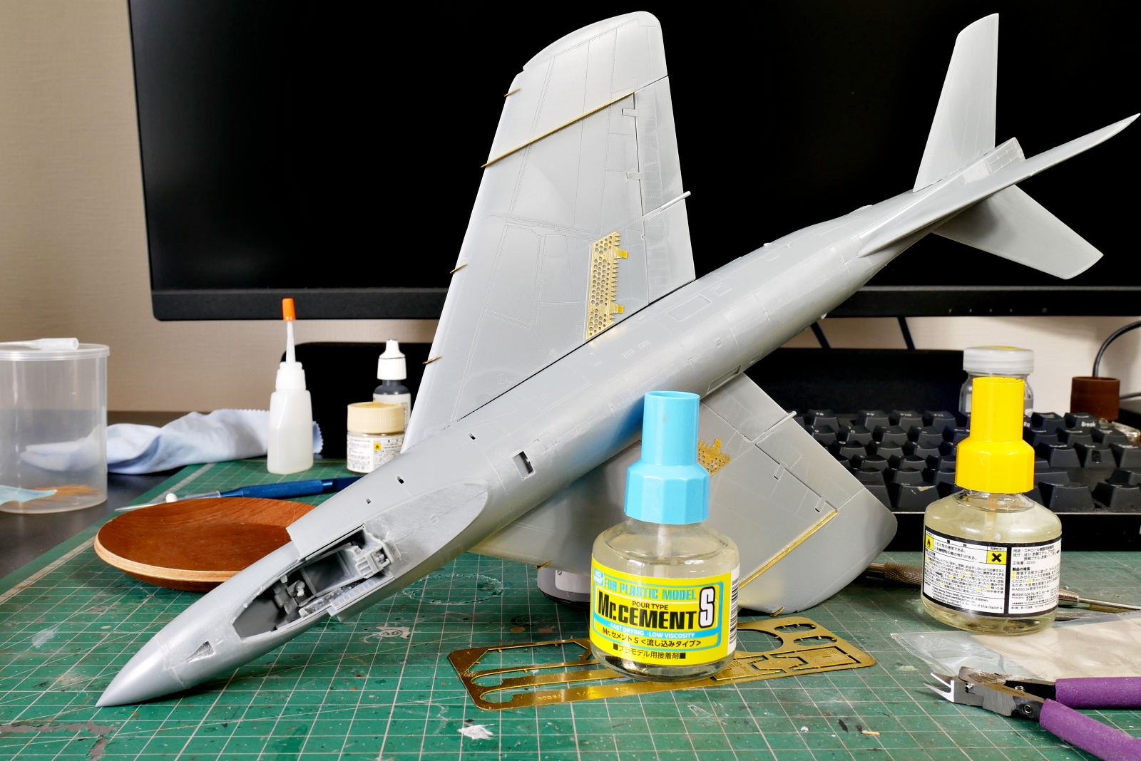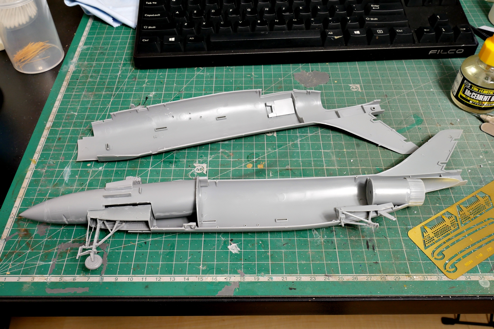 コックピットやエンジンノズル、着艦フックなど左右の貼り合わせ時にはいろいろと挟むものが多いです。