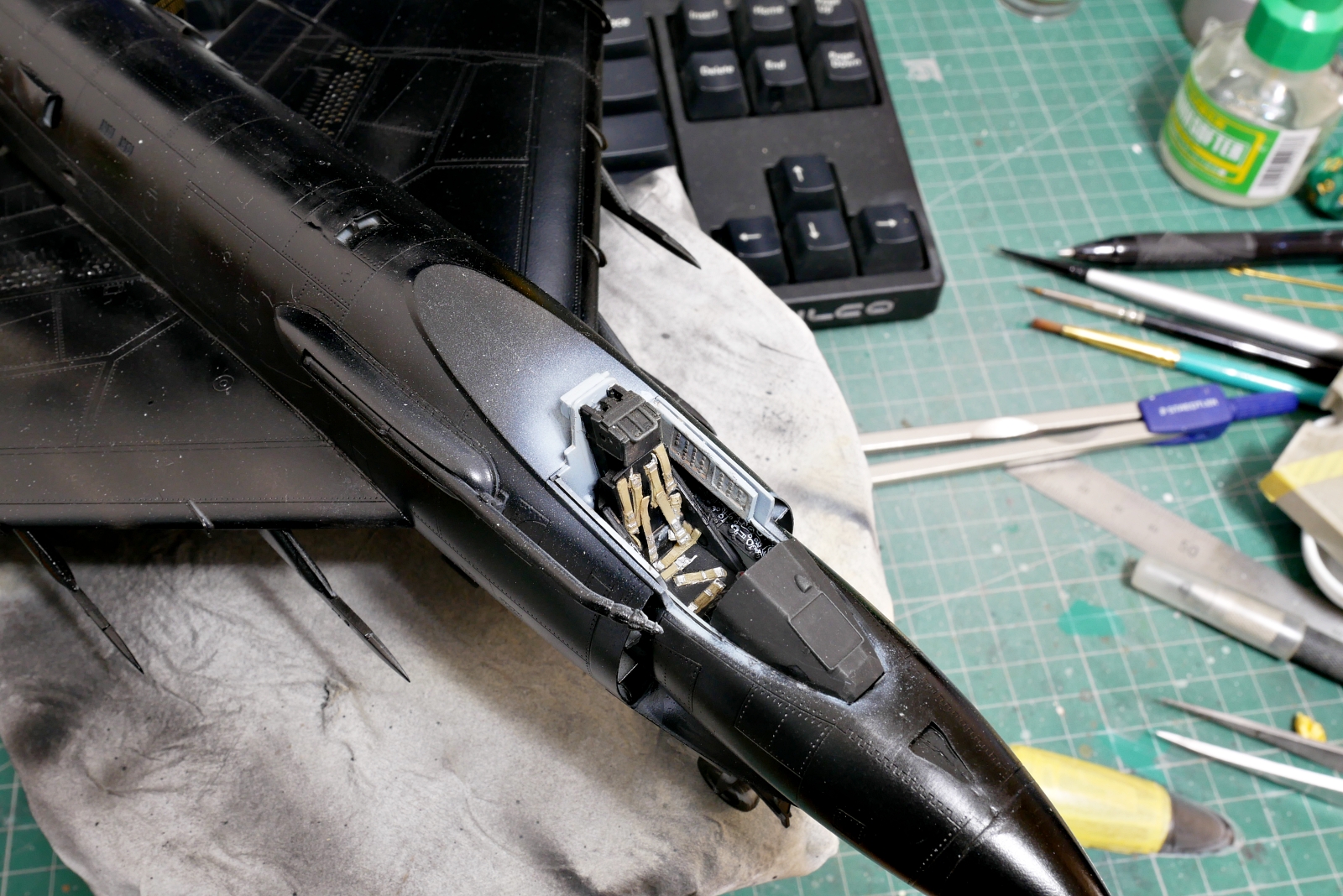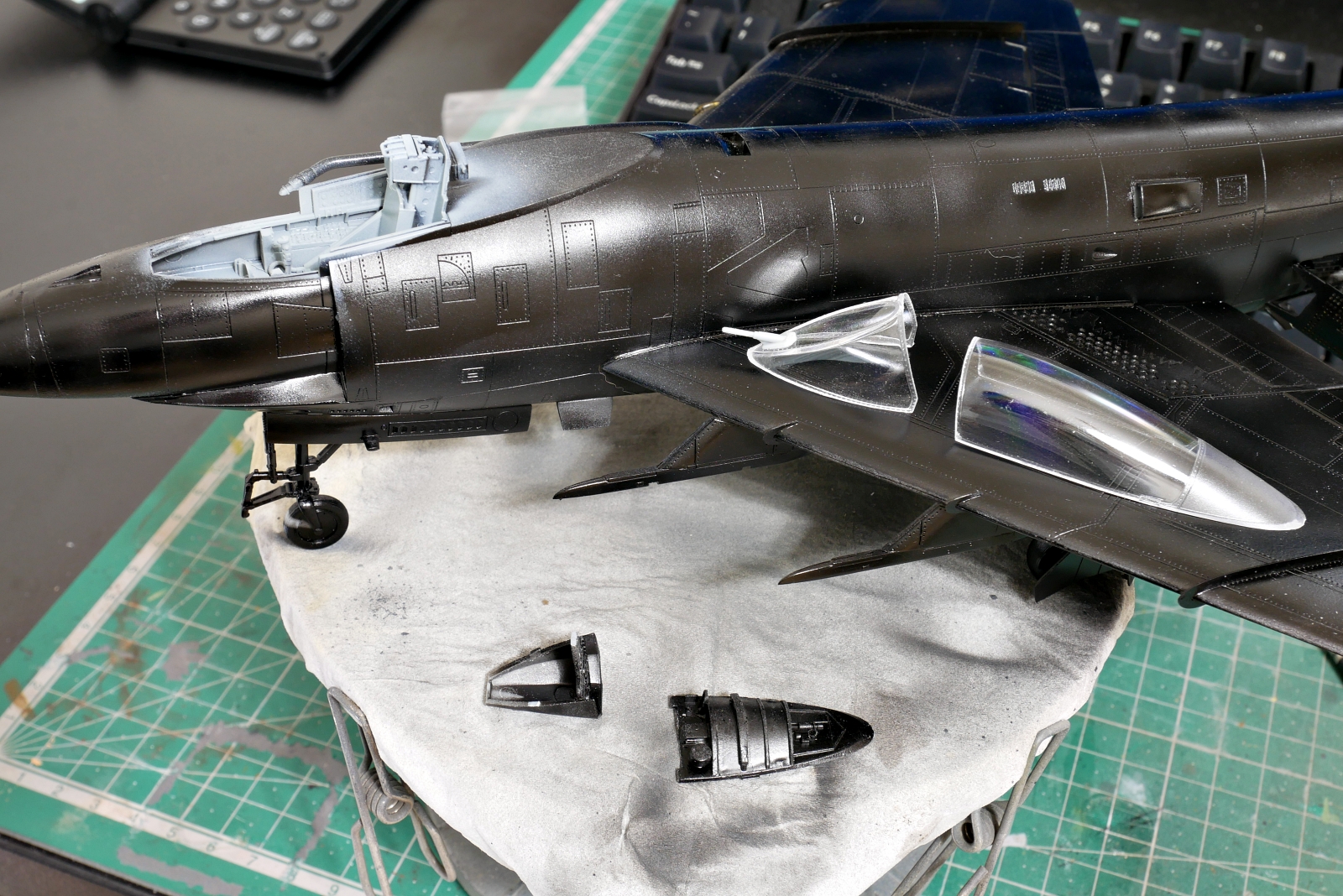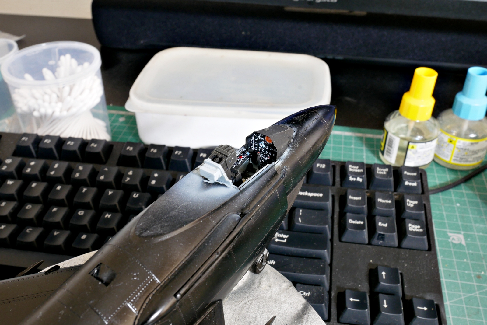 コックピットやエンジンノズル、着艦フックなど左右の貼り合わせ時にはいろいろと挟むものが多いです。