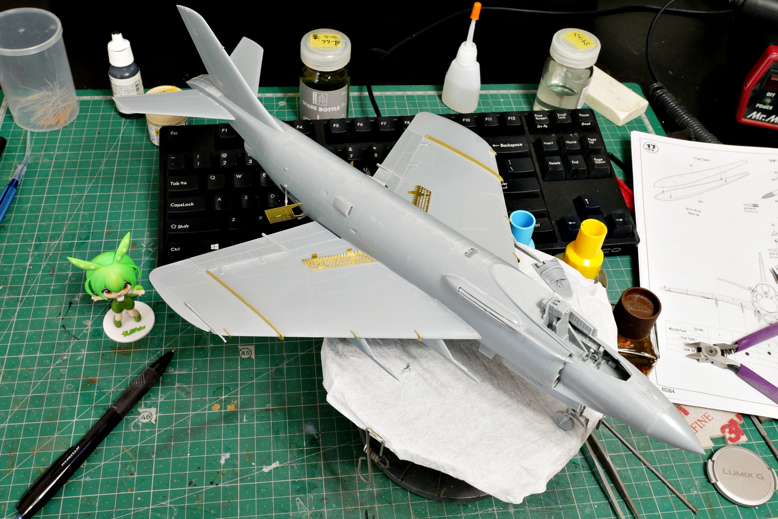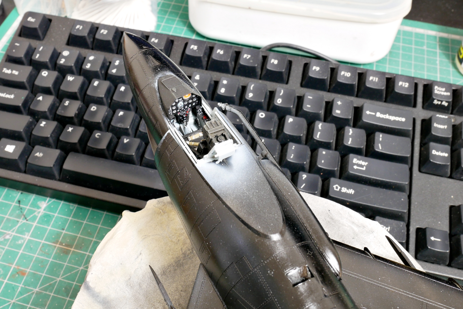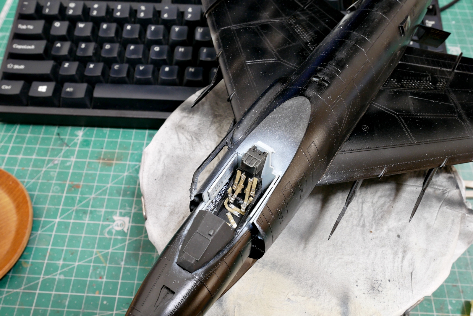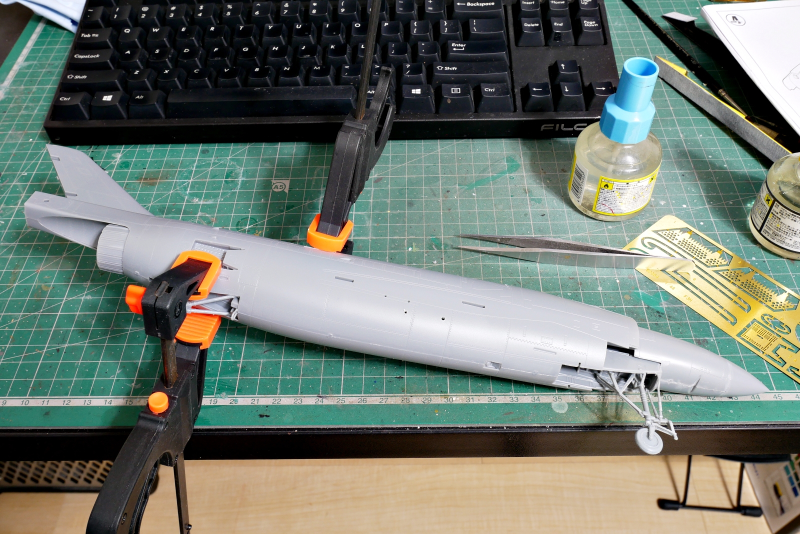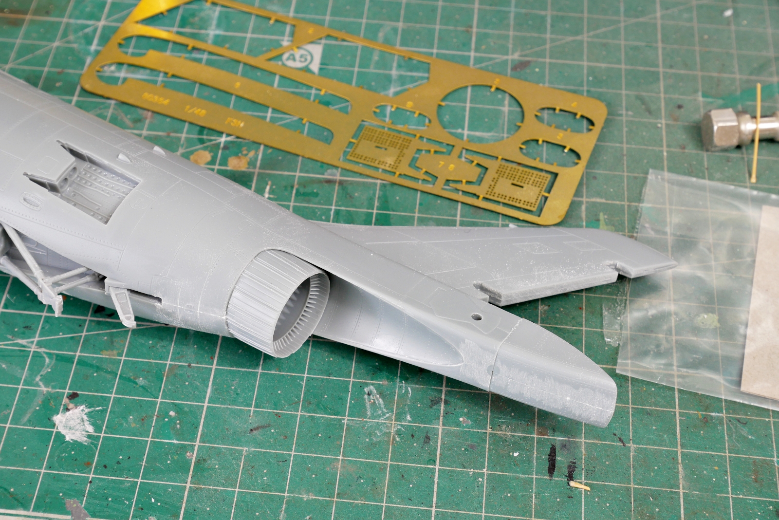 機体の後部も組み立て中です。こちらも軽く整形の最中です。ジェットエンジンノズルのパーツのモールドがけっこう細かいです。ビーバーテイルの長さ調整はパーツの交換じゃないと切り取ってパテで調整したり、長くするのはプラバンを切り貼りして曲面を出したりと、可能な気もするけど作業難易度は上がりそうです。