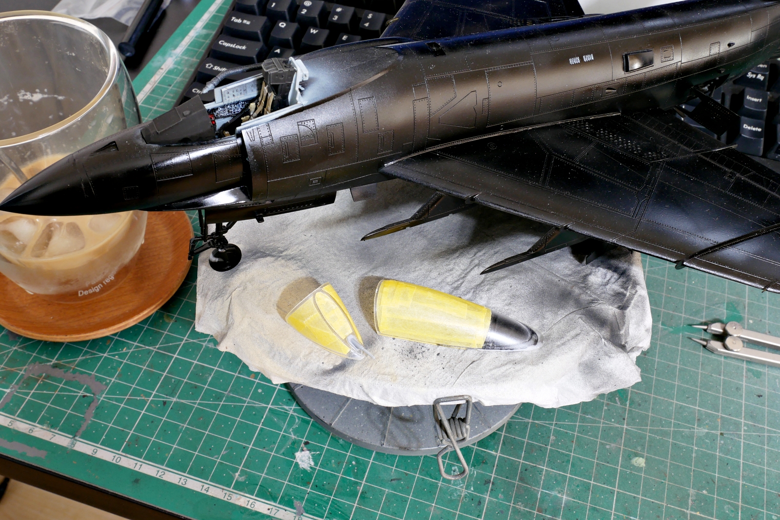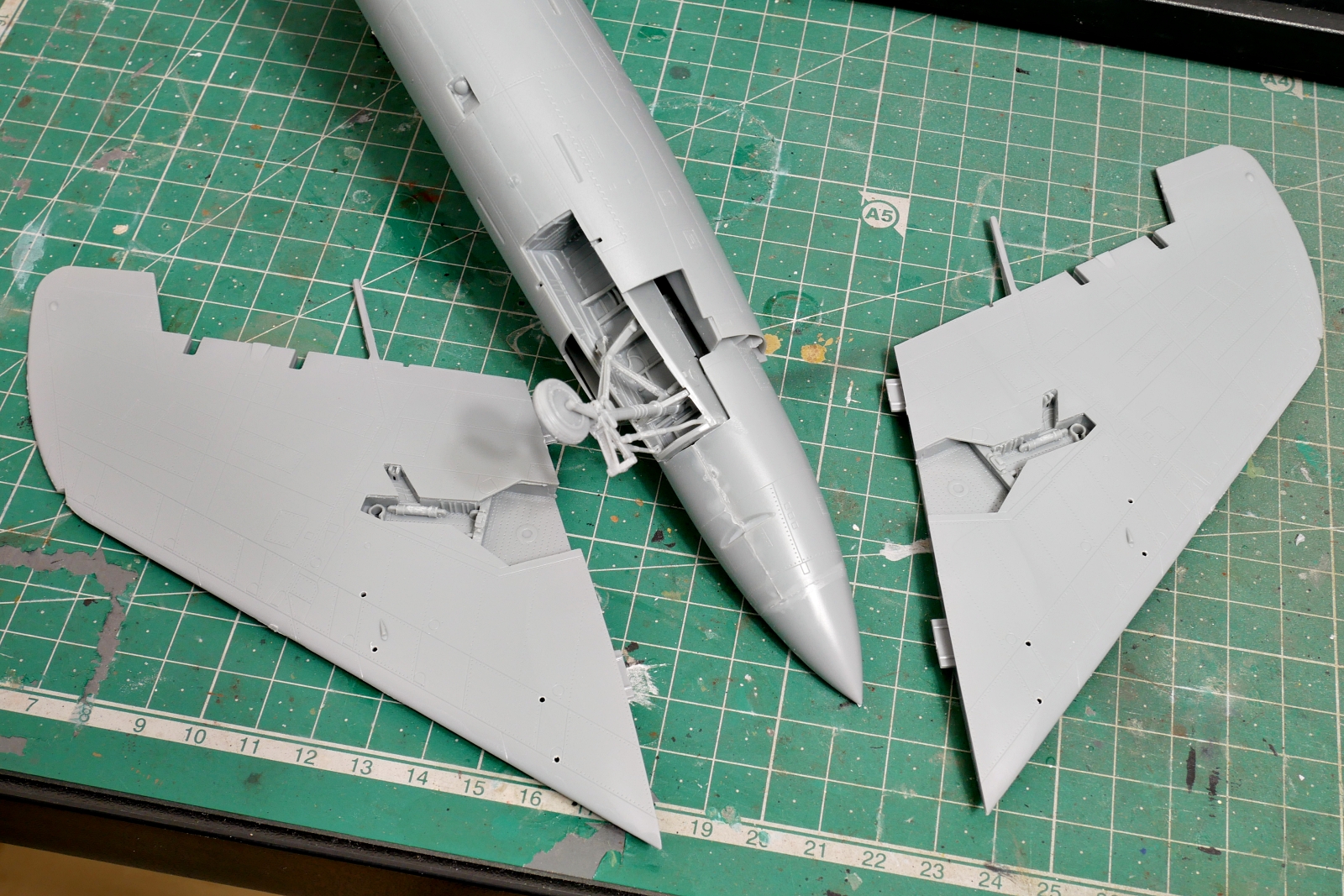 主翼も組み立てました。パイロンの穴を開けて大きなパーツである主翼の上下を貼り合わせました。
