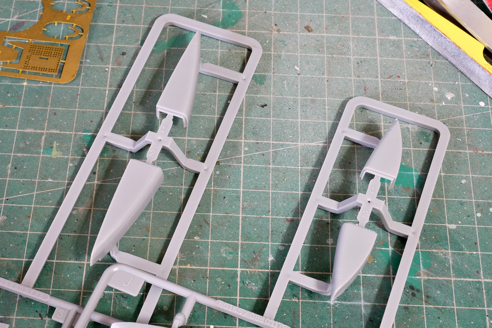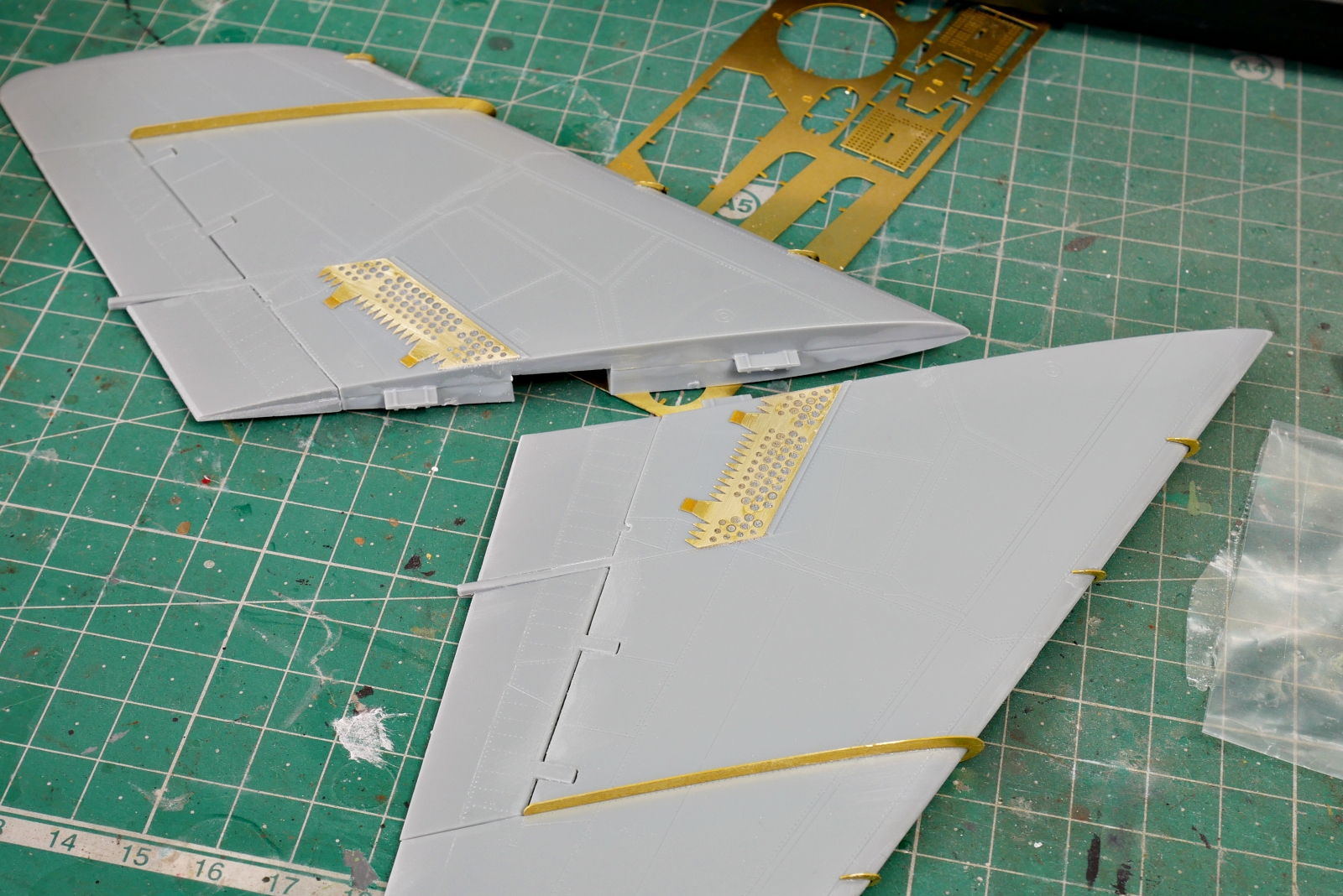 ジェットエンジン内部や主翼上面、胴体横のエアブレーキの内側などにエッチングパーツを使うようです。けっこう厚みがあって丈夫な材質です。