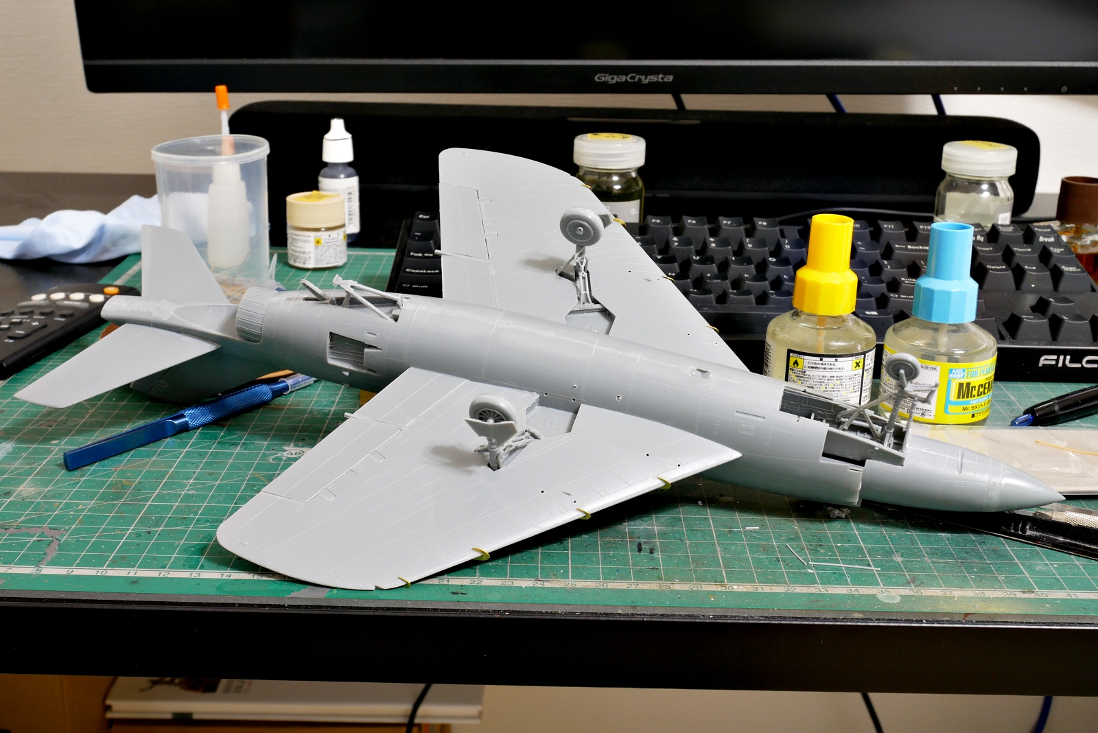 今回はほぼ最後まで組み立てを完了させてしまいました。まだコックピットの内部の塗装が残っているので、そこを仕上げないと全体塗装には進めません。