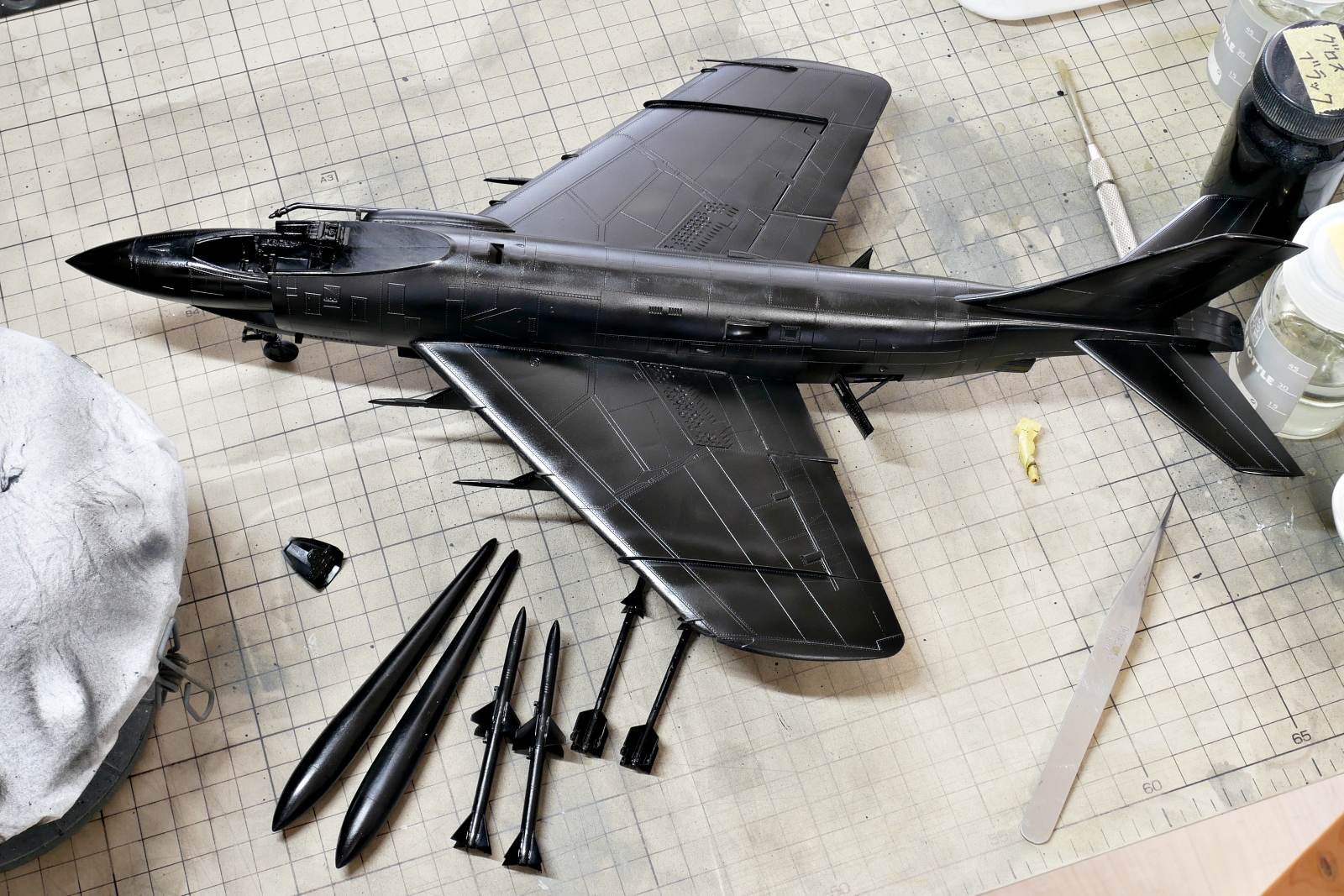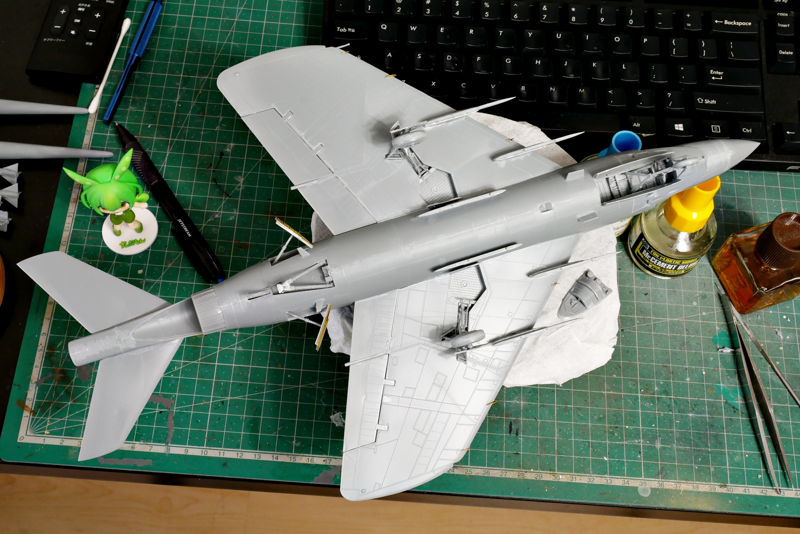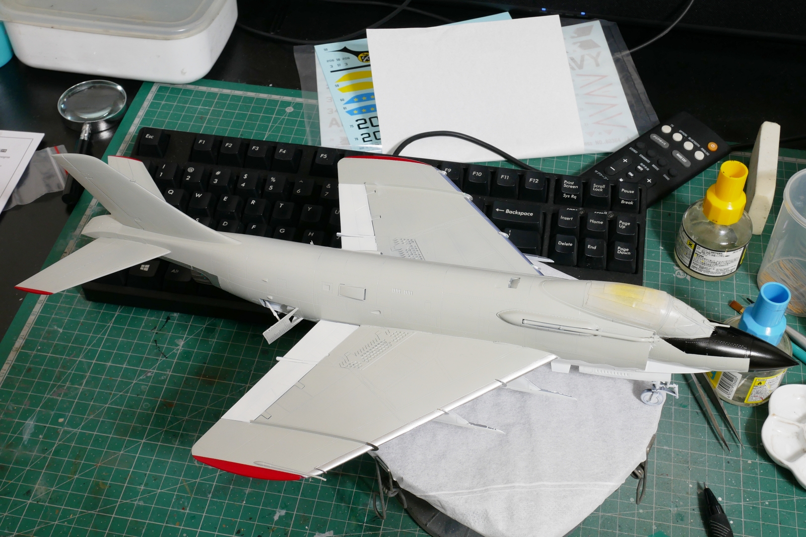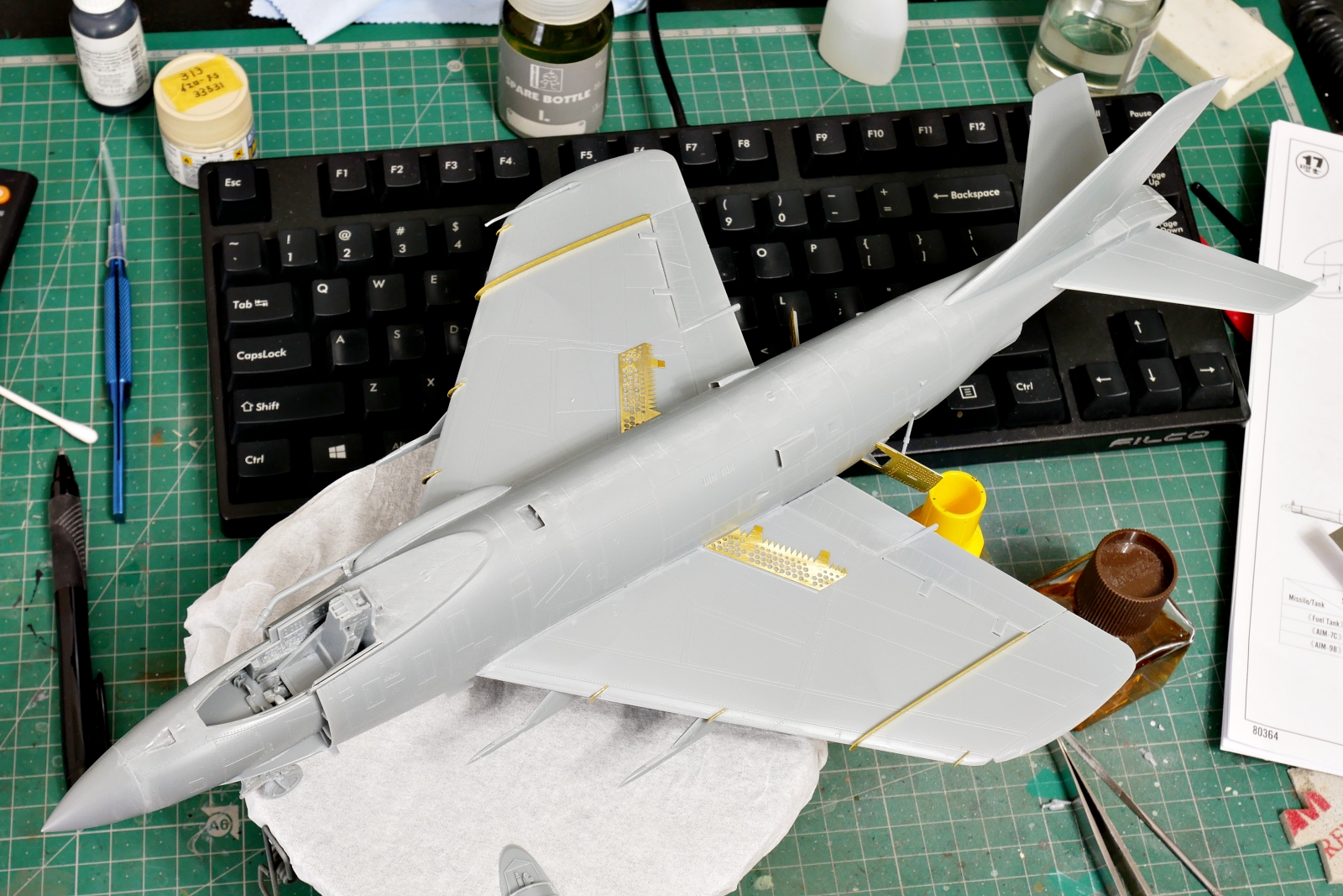 “F3H-2 デーモンの組み立てがひとまず完了しました。独特なフォルムと重厚感のある機体は、作っていても存在感抜群です。今回は機体下面の塗分けが殆どないので先に組立を終わらせました。これからコックピット内部の塗装や外部の塗装に入ります。エッチングパーツの取り付けも終えたので、細部の塗装も含めるとまだ道半ばかなぁ。
