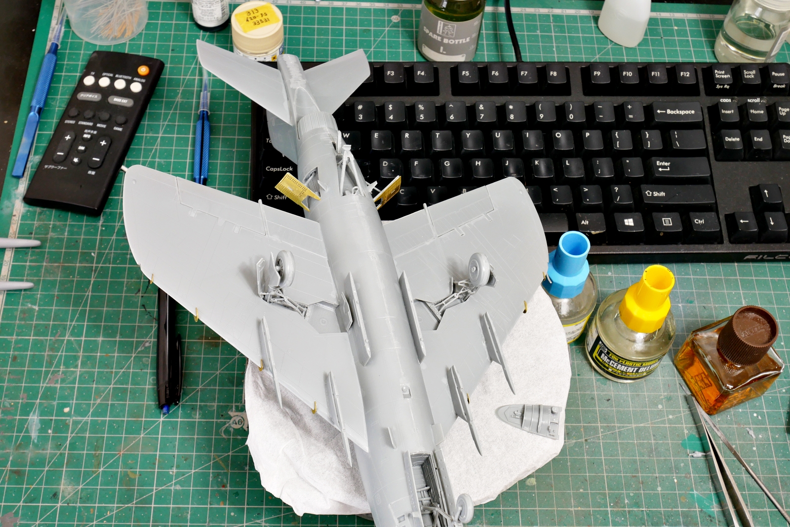 そして機体上面のライトグレーを塗装中です。この辺も一部はあとでデカールを貼ったり、塗分けが必要な部分があったりといろいろです。