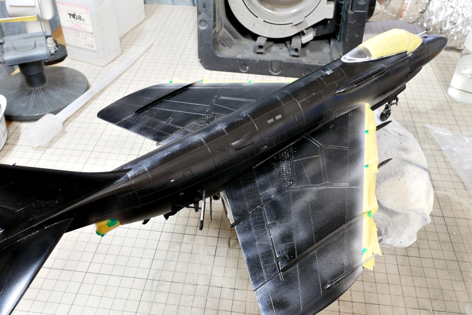 今回は機体下面のマスキングのほうが手間が掛かると予想して、上面のライトグレーを塗ってから上側をマスキングしました。いやいや、こっちのほうが手間が掛かる気もしますがここまでやらなくても良かったかな。エアブラシの細吹きで圧を弱めれば反対側への塗料の巻き込みはあまりないかもしれないのでここまで厳密にマスキング作業しなくてもなぁ。