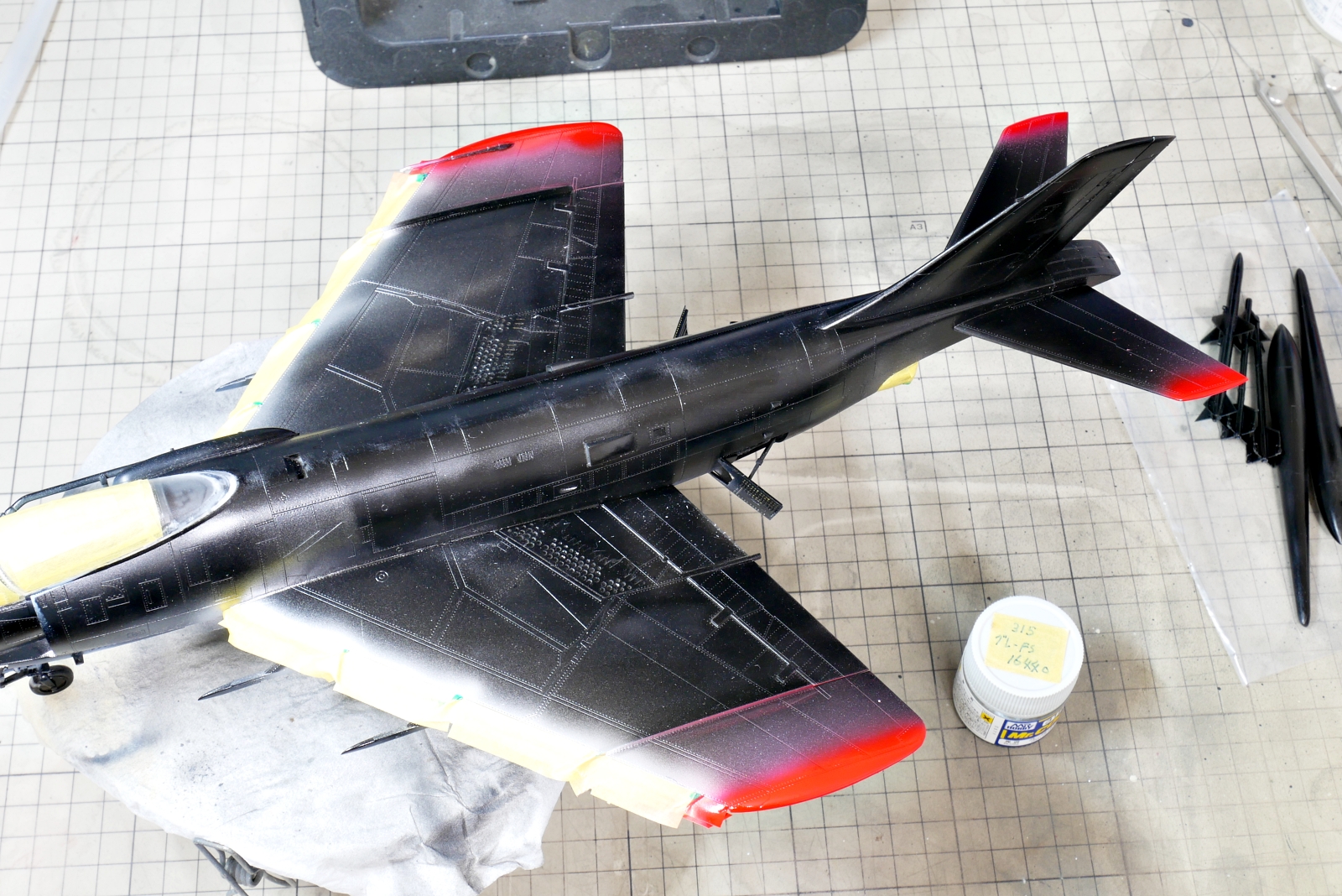 シルバーを塗装してマスキングをしたら、翼の端っこを赤く塗装しました。発色を良くするためにその前に白を吹いています。