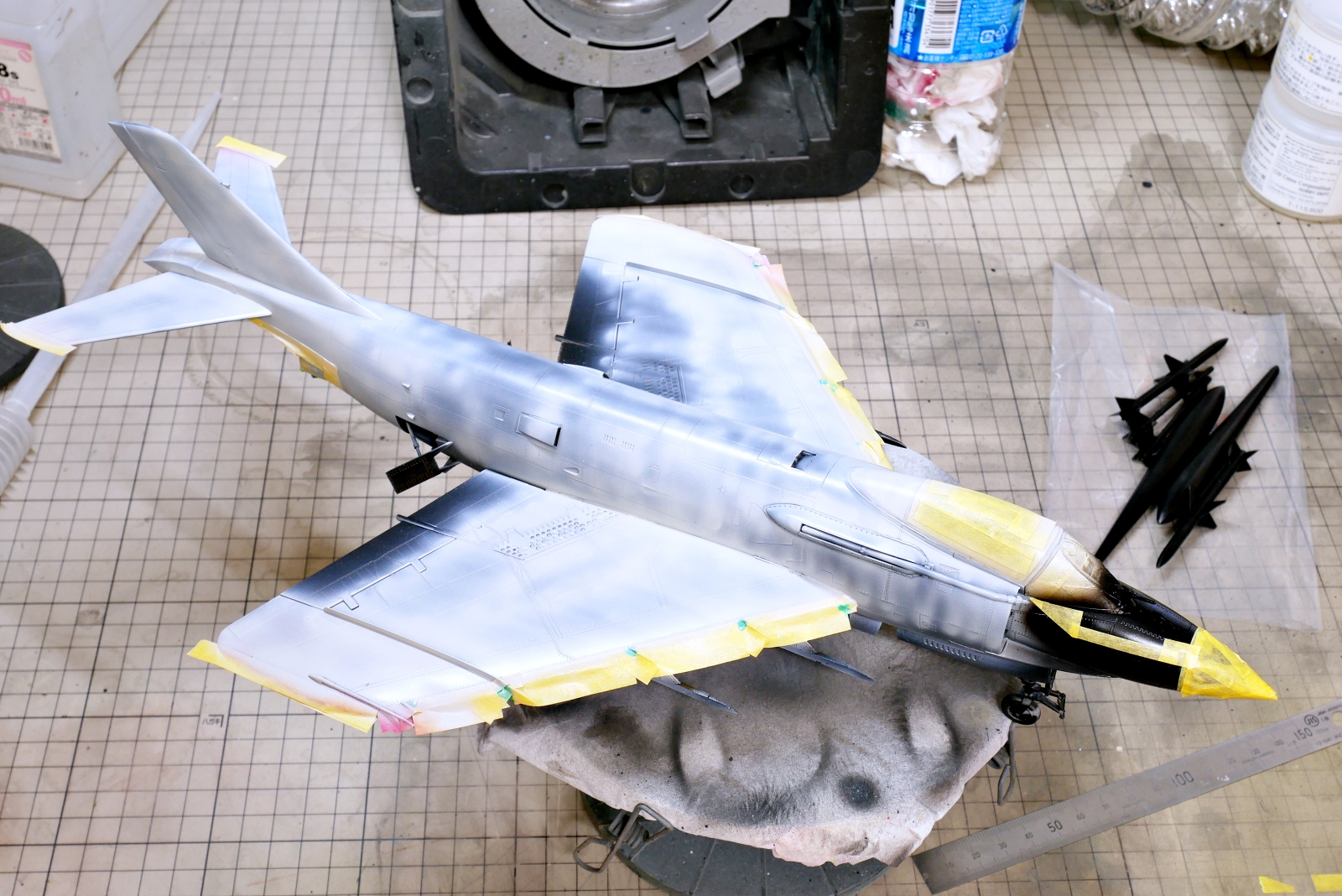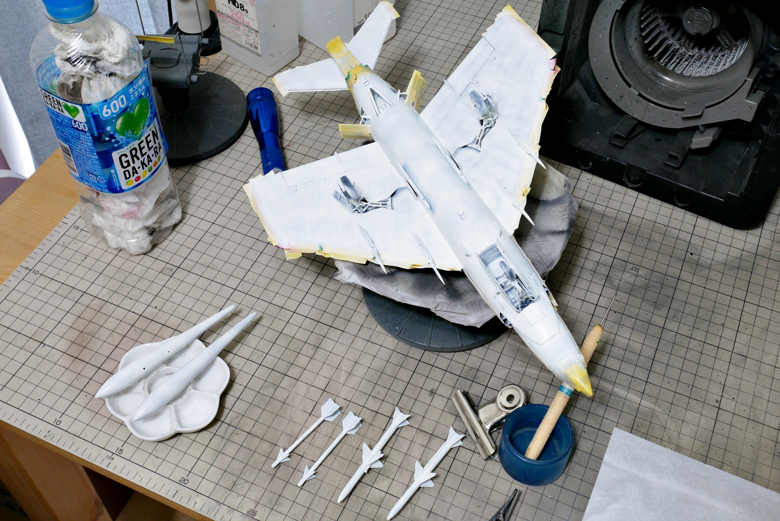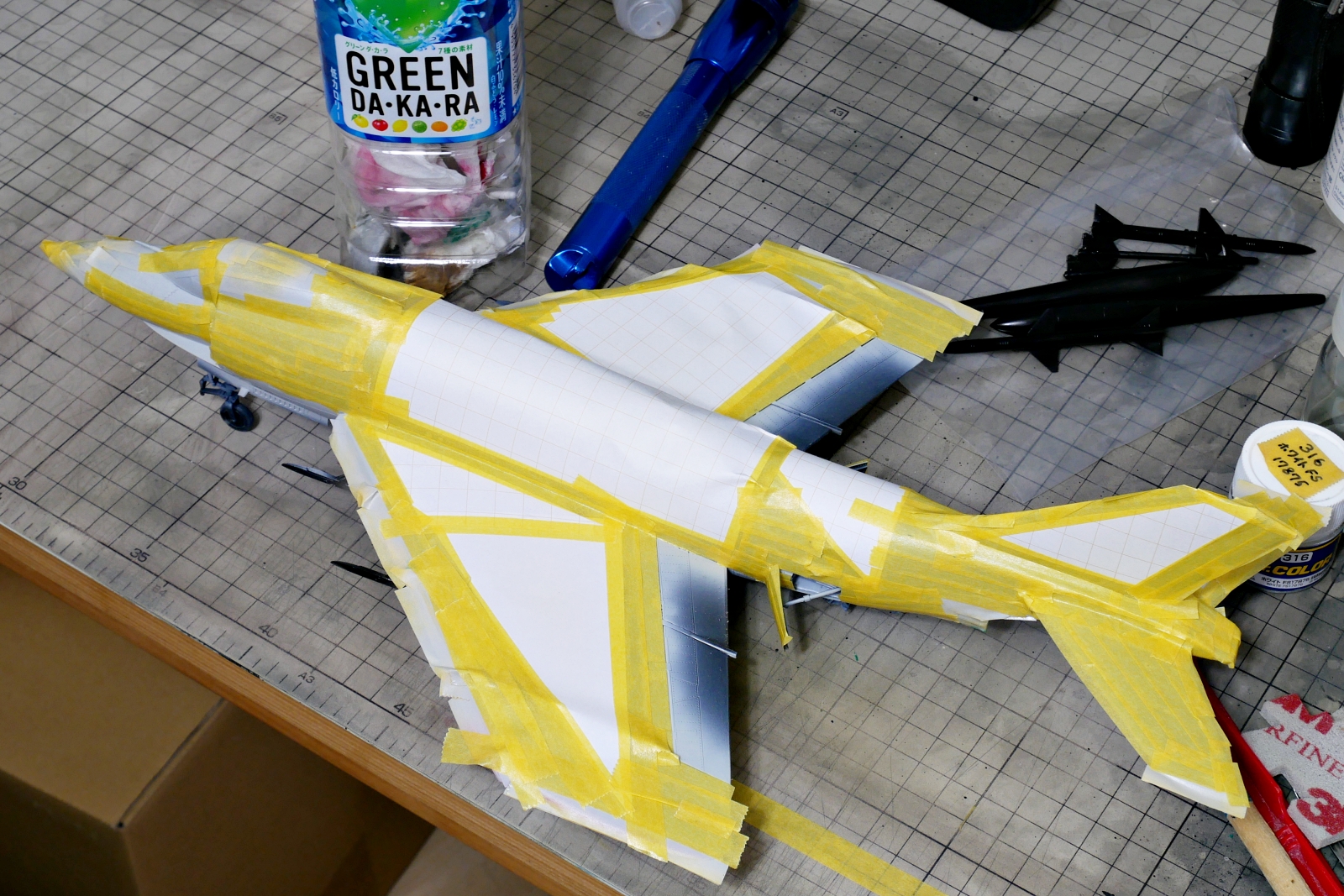 これ、ホワイト、ものすごく塗料を使います。キットのサイズが大きいというのもありますが、他にミサイル類や増槽も同色で塗装するので。Mr.カラー1本は使わないけど半分以上は無くなりましたかね。あとではみ出した部分のリタッチにも少し塗料を残してておかないといけないし。
