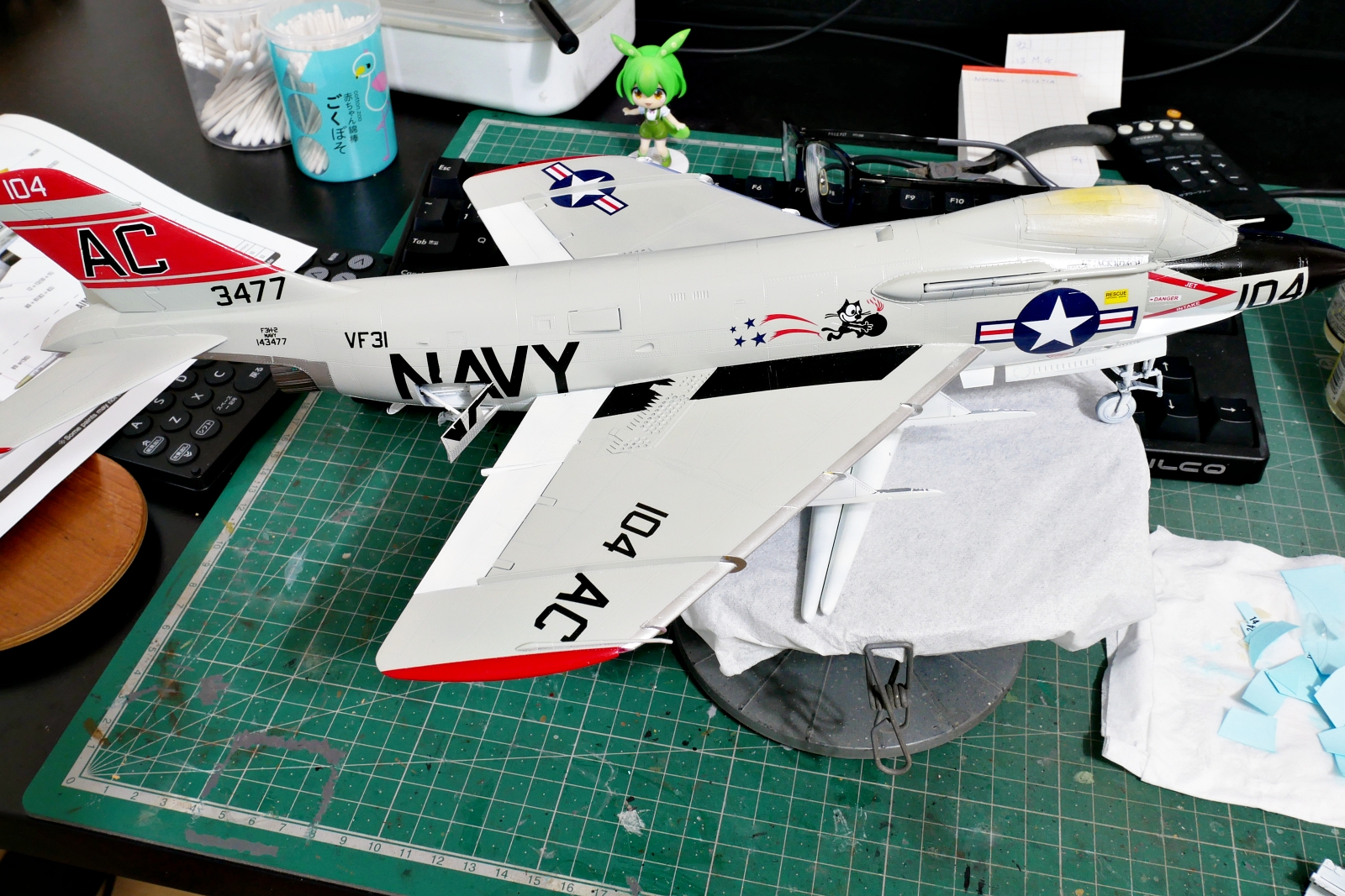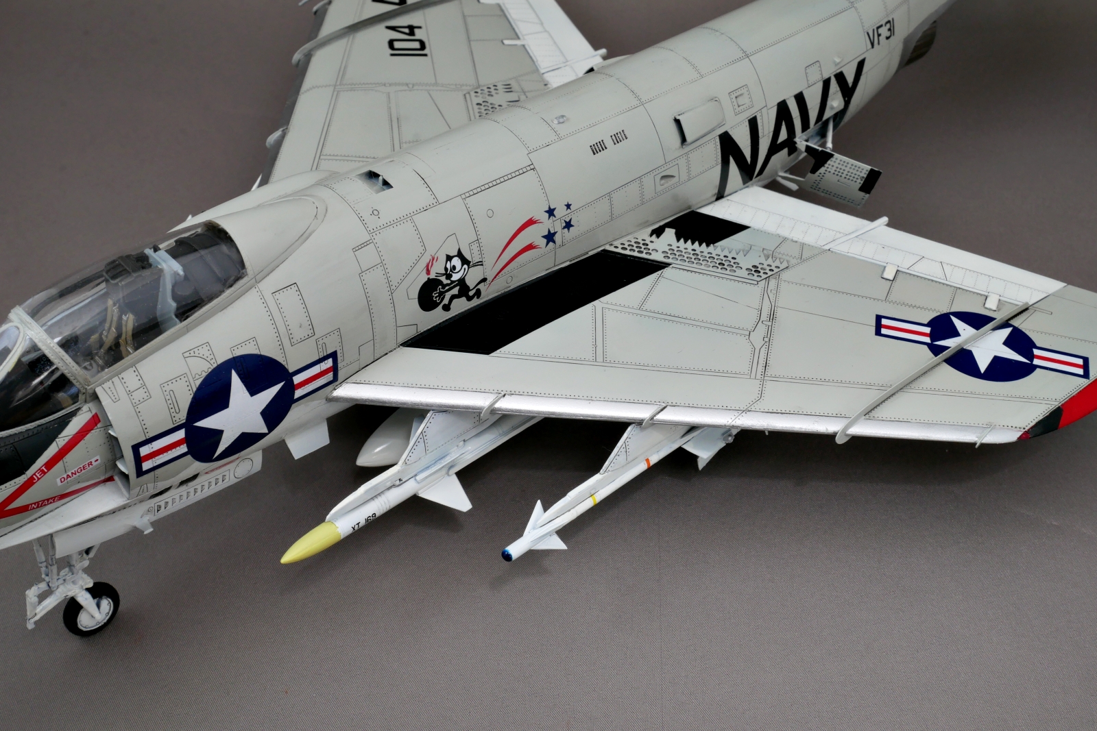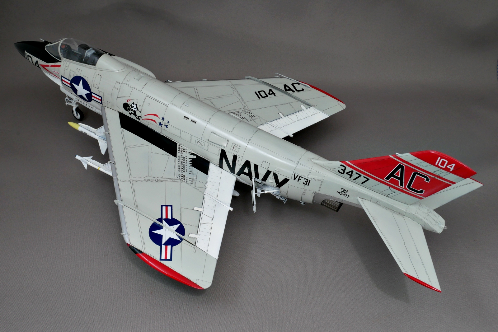 マーキングは4種類から好きなものを選べました。今回は箱絵のような赤がメインのアメリカ海軍VF-31″Felix the Cat”のマーキングとしました。1957年にバンシーからデーモンに機種変換されて、その後1966年にはF-4ファントムIIに機種変換されているのでだいたいその間のマーキングなのでしょう。