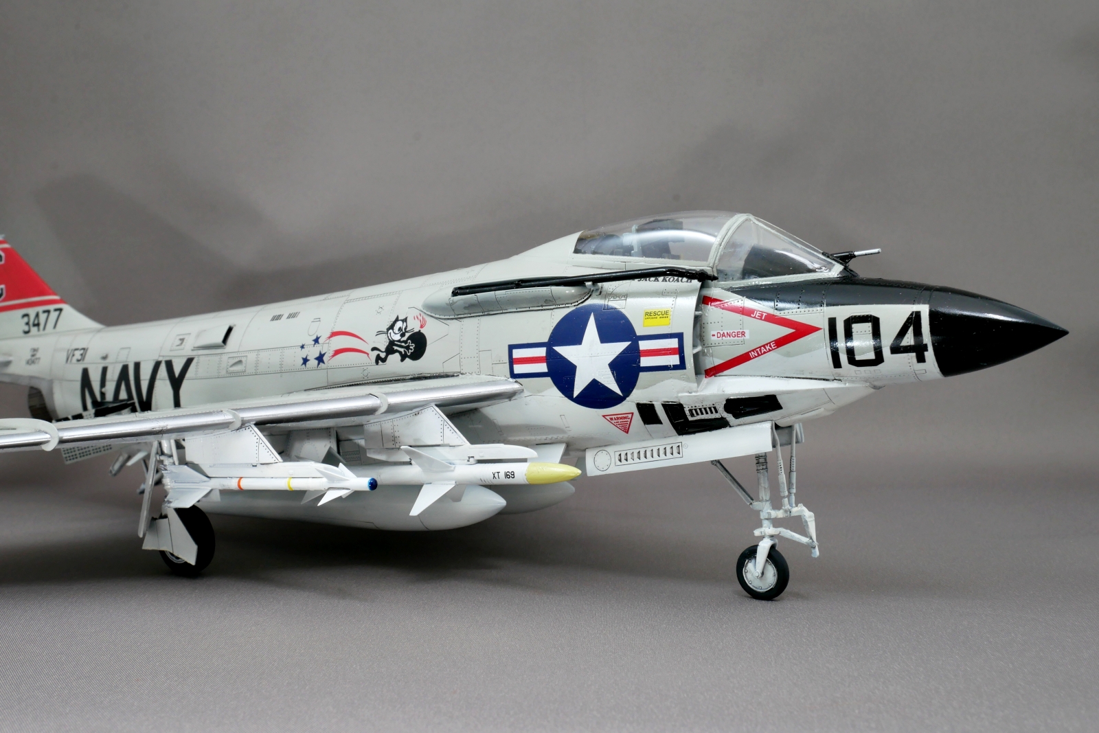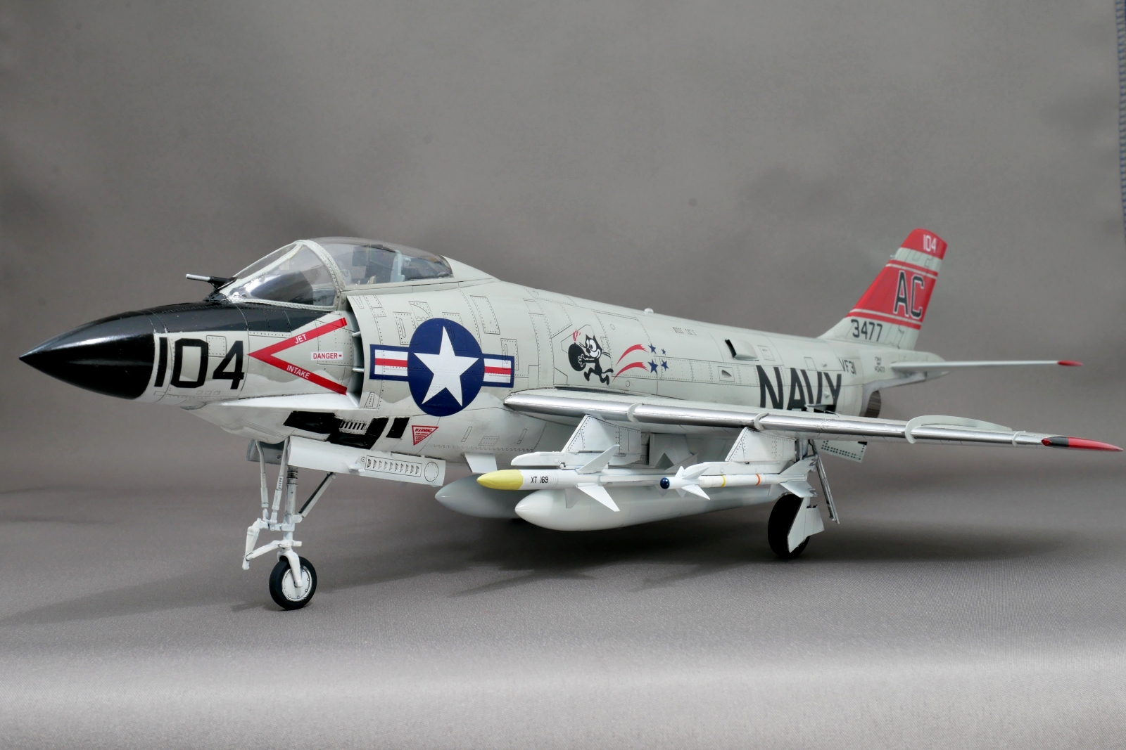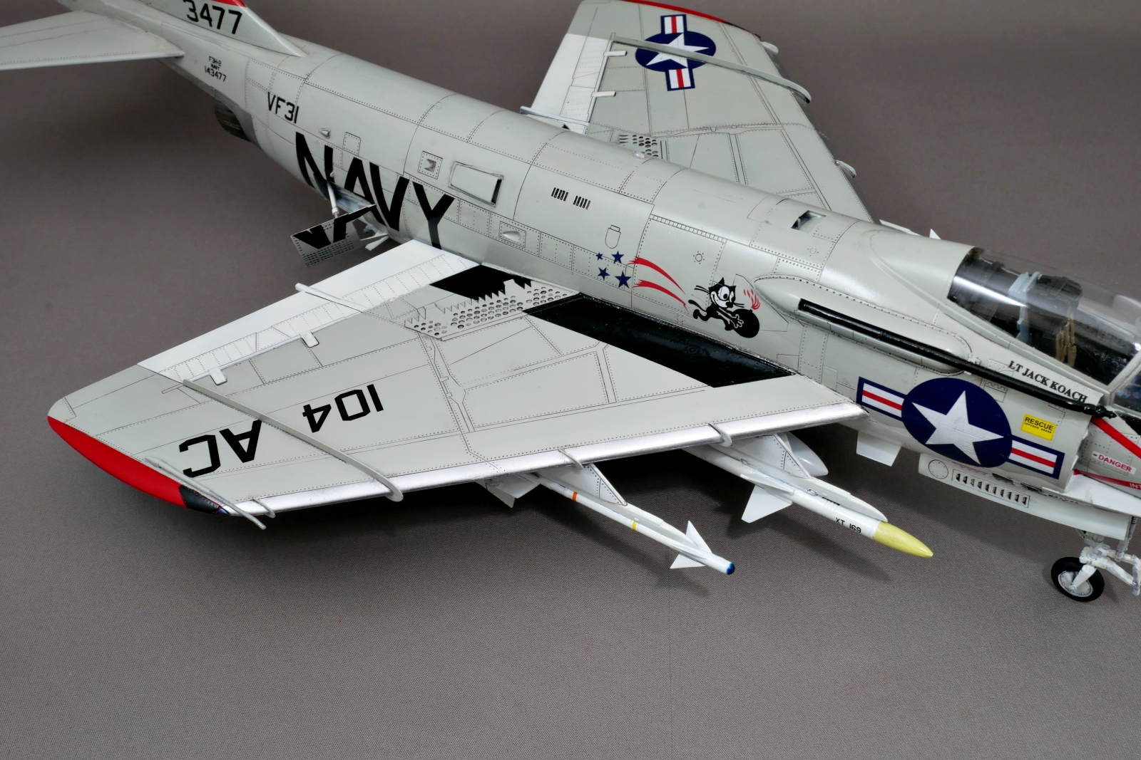 マーキングは4種類から好きなものを選べました。今回は箱絵のような赤がメインのアメリカ海軍VF-31″Felix the Cat”のマーキングとしました。1957年にバンシーからデーモンに機種変換されて、その後1966年にはF-4ファントムIIに機種変換されているのでだいたいその間のマーキングなのでしょう。