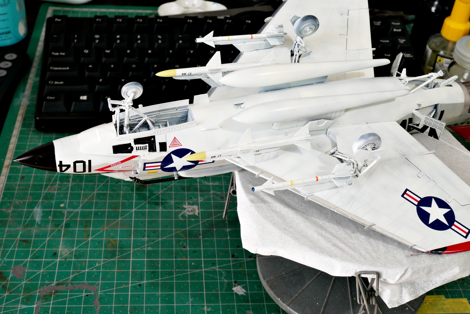 うんうん、ミサイルはスパローとサイドワインダー、それと増槽を2本、積めるものはなるべくたくさん積んだほうが格好良いかなと思いました。よく偵察機も作るんですけどその場合は武装が無いことが多くてあっさりしてますよね。
