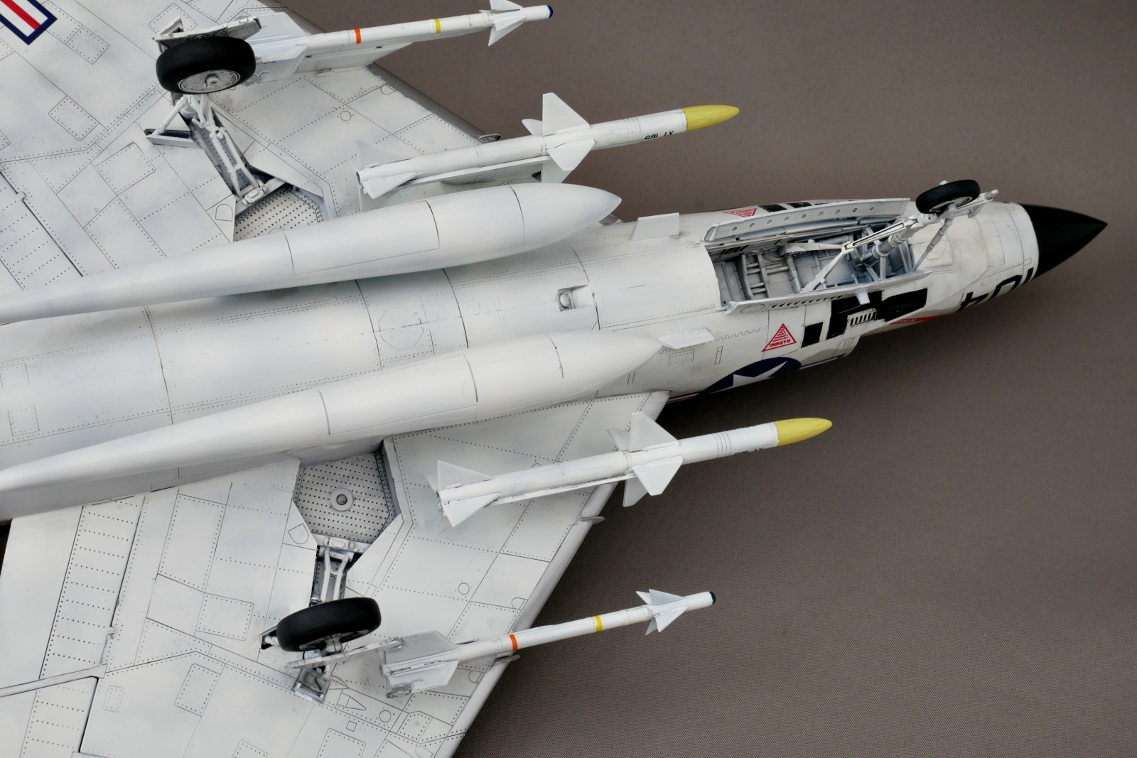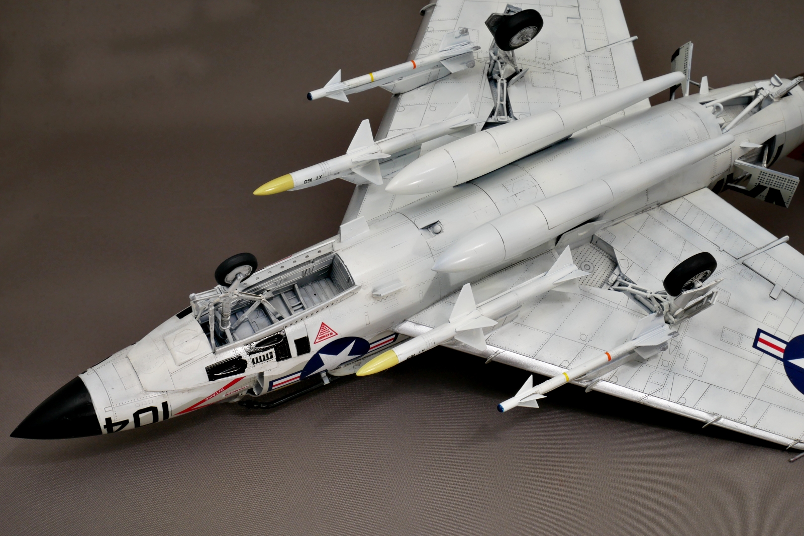 作っていて胴体がものすごく太く感じました。F3Hは当初、J40エンジンを搭載する予定でしたが性能不足で計画変更。代替として選ばれたアリソンJ71ターボジェットは非常に大きく、胴体を太く設計する必要がありました。エンジンの空気取り入れ口(インテーク)も胴体側面に配置され全体的に幅広な印象に。