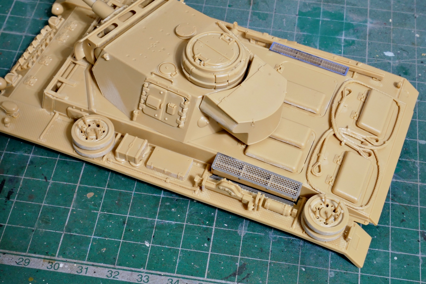 だいたいの組み立てが完成しました。最近は現用主力戦車もちょこちょこと作っているので、ドイツIII号戦車の砲身が細く感じられました。これじゃT-34は撃ち抜けませんからね。