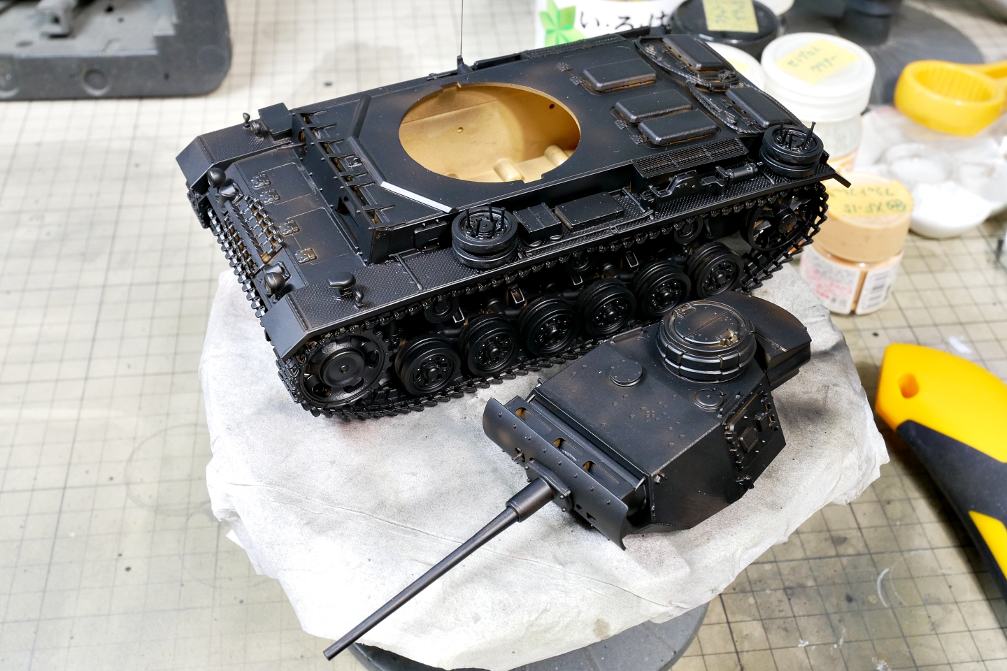 タミヤのキットは全然トラブルもなく組み立てられるので特段記述することもないんですよね。とりあえず転輪が多いのでモーターツールが役に立ちます。自分が長年使っているのは回転数が調整できるのでゆっくり静かにサンディングできるのがとても気に入っています。