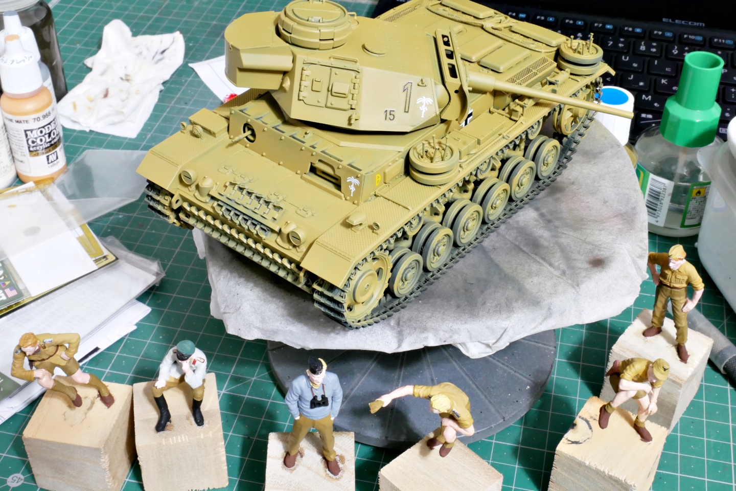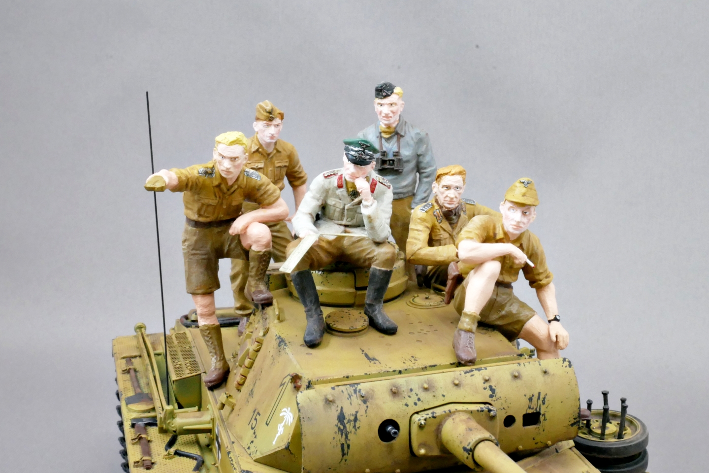 あのごちゃごちゃした小さいIII号戦車の砲塔の上に固まって配置されているフィギュアたちです。6体あるから塗りごたえありそう。最初に肌色をエアブラシしました。短パンの兵士もいるので肌の露出面積が大きいです。