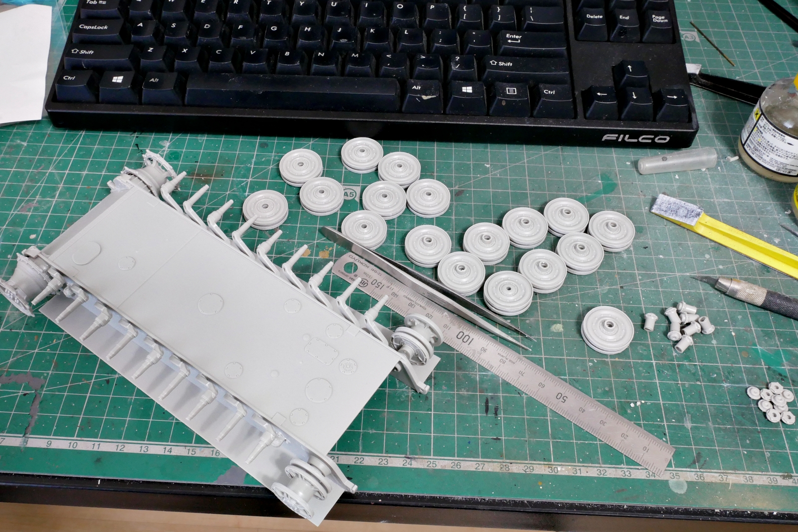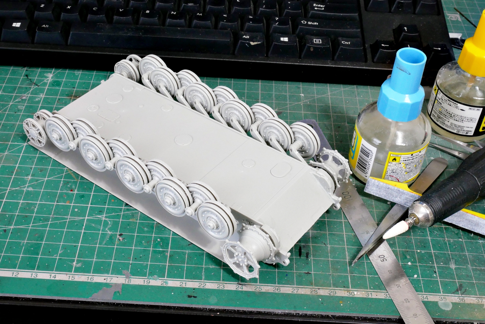 過去にメーカーは違うけどいろいろ作っているのでこのへんはそんなに迷うことなく作業が進みます。転輪の側面に別パーツを貼り合わせるようになっていました。