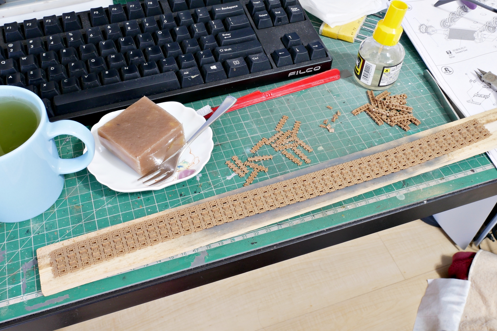 このあいだ松本に遊びに行ってきたときのお土産の栗羊羹でも食べながらダラダラ組み立てていました。パーツが多くて同じ作業の繰り返しだから飽きてきます。その点では部分連結のほうが簡単なんだけど、履帯のなだらかな垂れ具合とかは普通の連結履帯のほうが調整しやすいと思います。