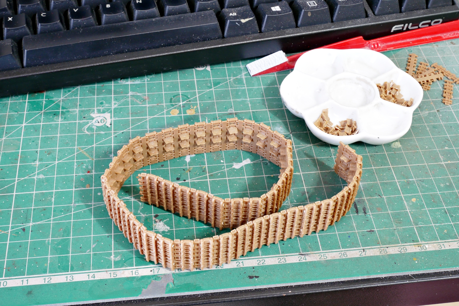 もう片側の履帯も製作中です。多少は接合部分に接着剤がはみ出してもちゃんと可動するみたい。接着剤を点付け気味にしておいて巻いてから形状が決まったら一気に流し込み接着剤で全体を固着させるのが良さそうです。
