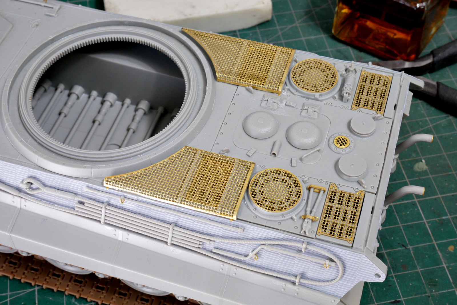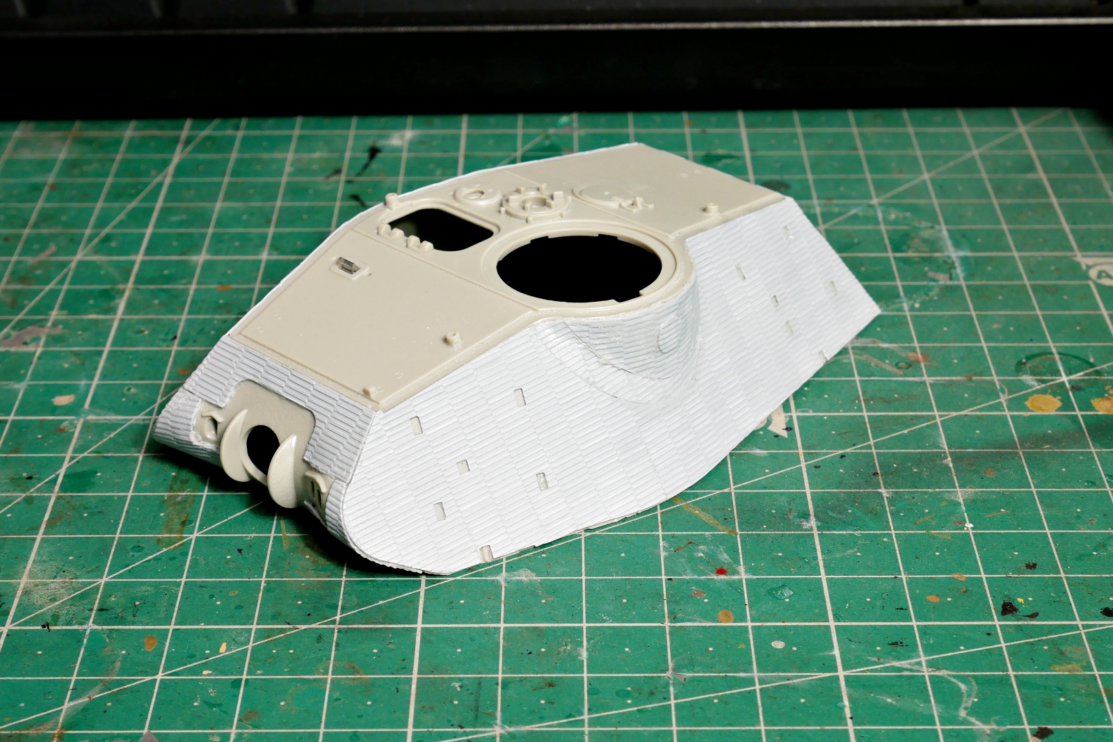 このツィンメリット・コーティングシート、想像よりもずっと使いやすいしきれいに貼り付けることが出来て驚きました。過去にはエポキシパテトローラーで苦労してコーティングしたことも何度かありましたけど、こっちのほうが簡単で綺麗に仕上がるのでとても良いです。デザインナイフでちょっと工夫すれば弾痕などバトルダメージもできると思います。今回はきれいに仕上げたいのでダメージはほとんど無しで作ると思いますけど。