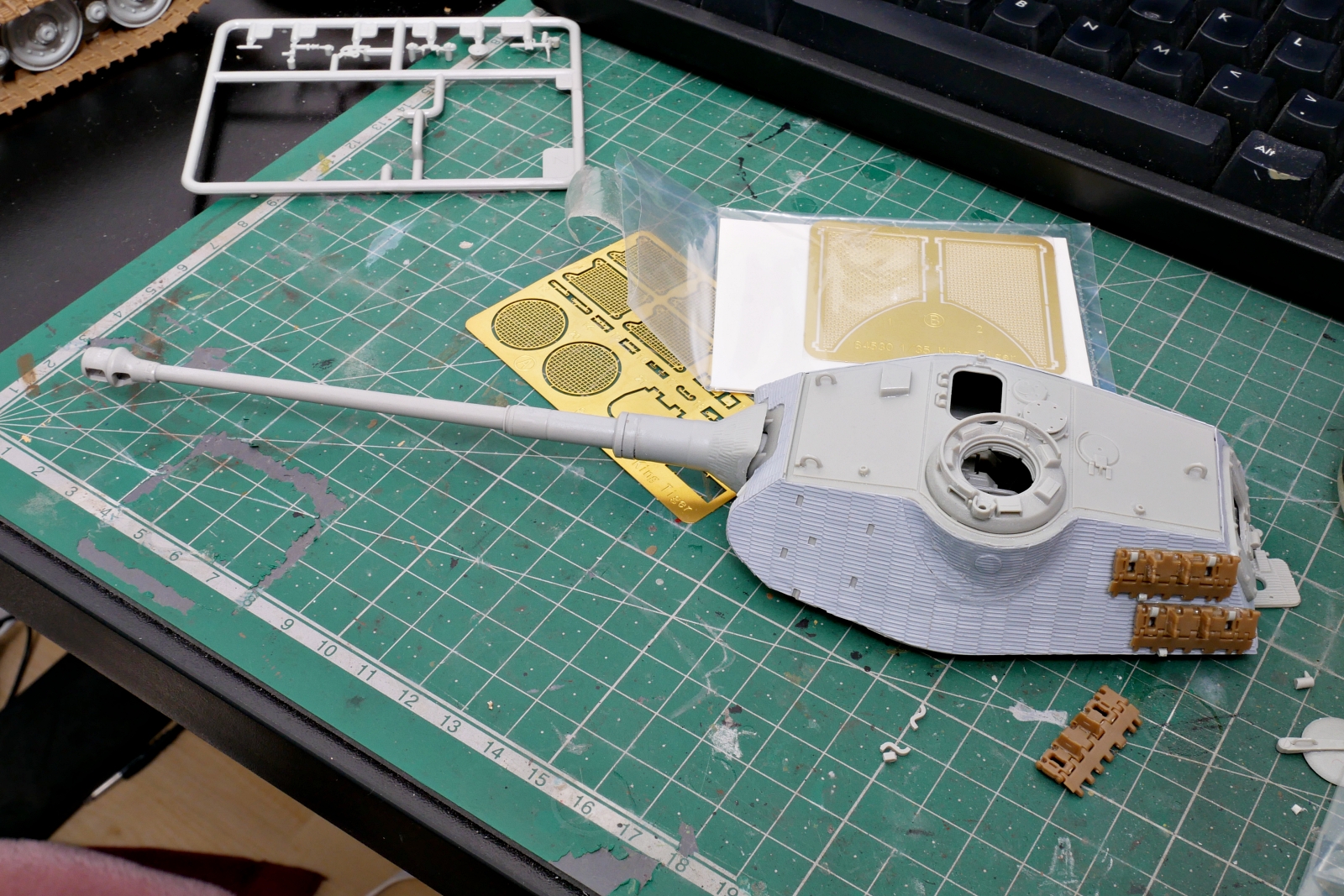 砲塔の組み立て中です。いくつかのプラパーツはコーティングモールドが施されているものと施されていないものの2種類あります。今回はコーティングシートを全面に貼り付けるのでプラパーツもモールド付きのものを選んでいます。砲身付け根の防盾とか砲塔のリアハッチなど。