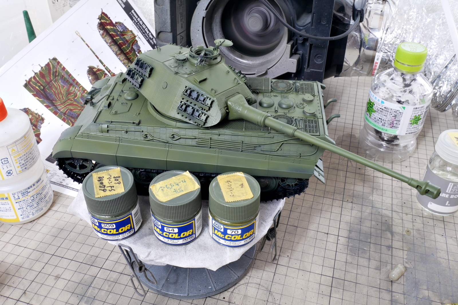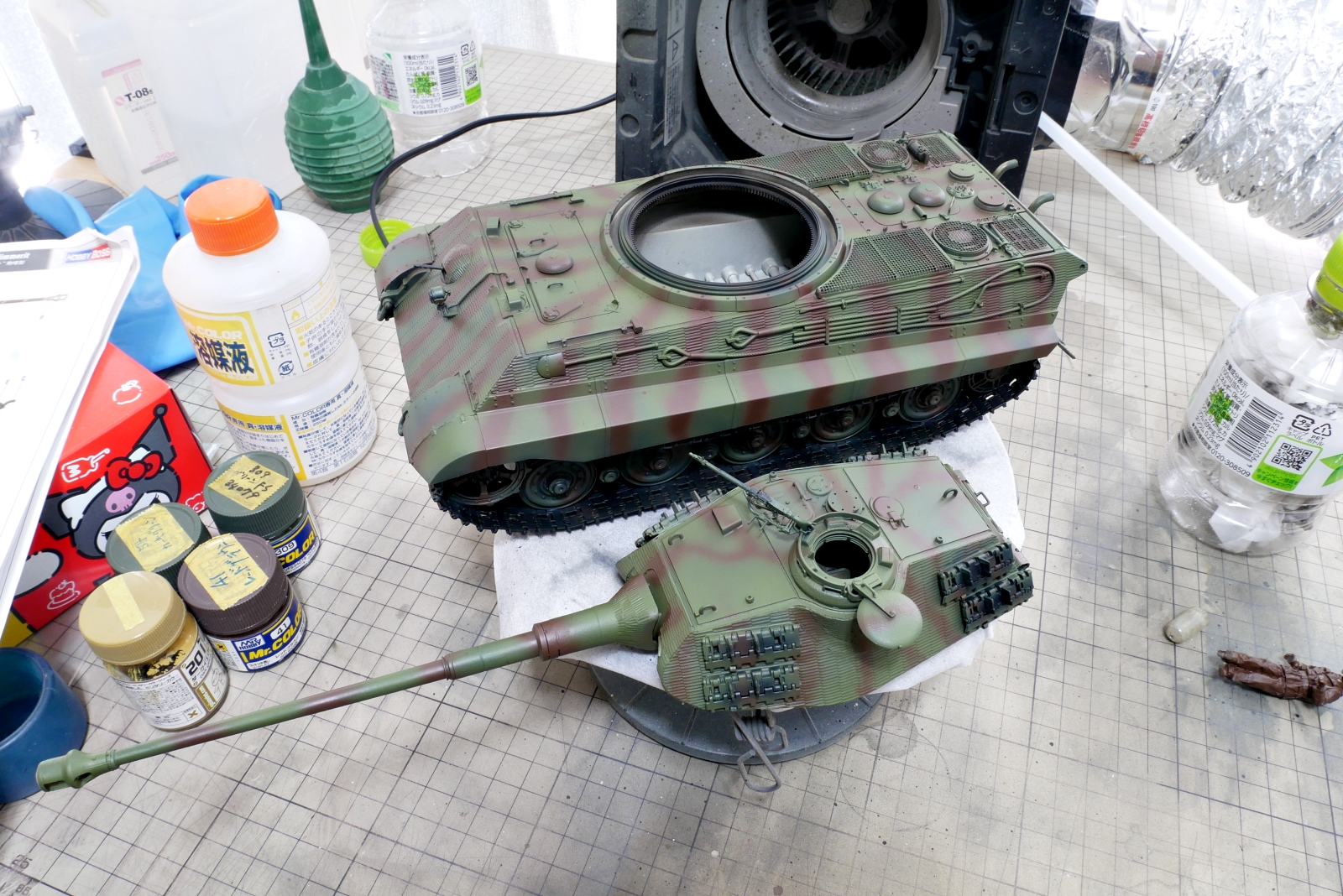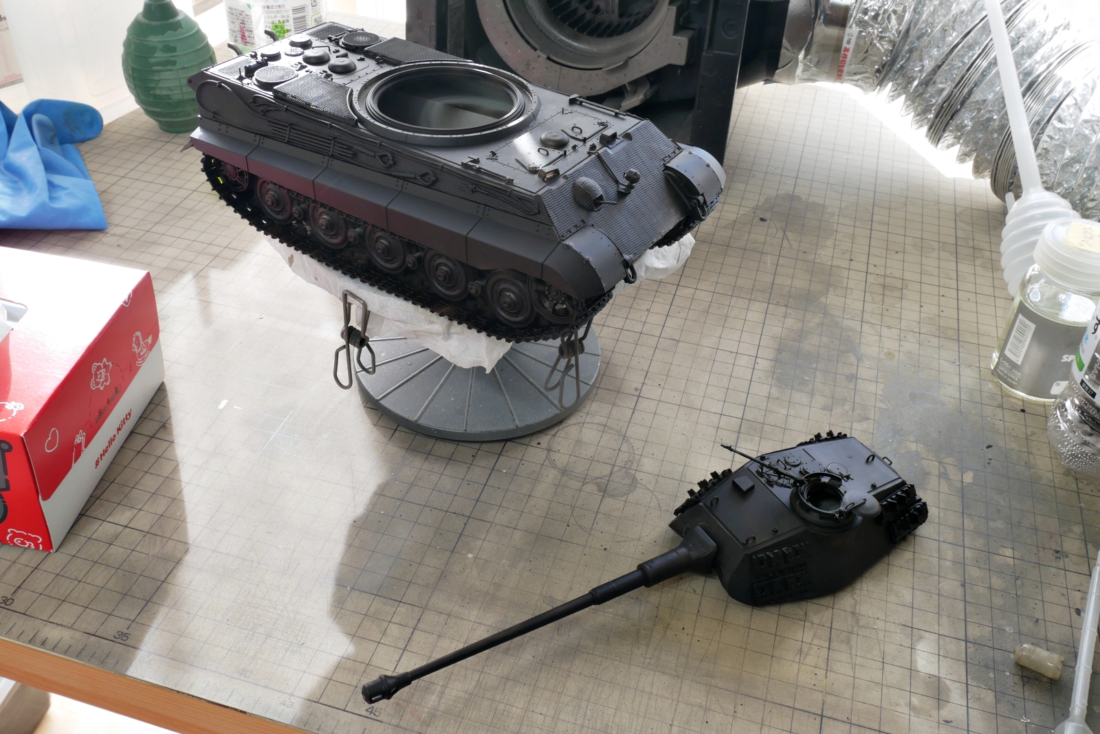 最近はそこまで寒くないのでちょっと塗装作業をしていました。最初にキングタイガーの全体にフラットブラックを吹きました。