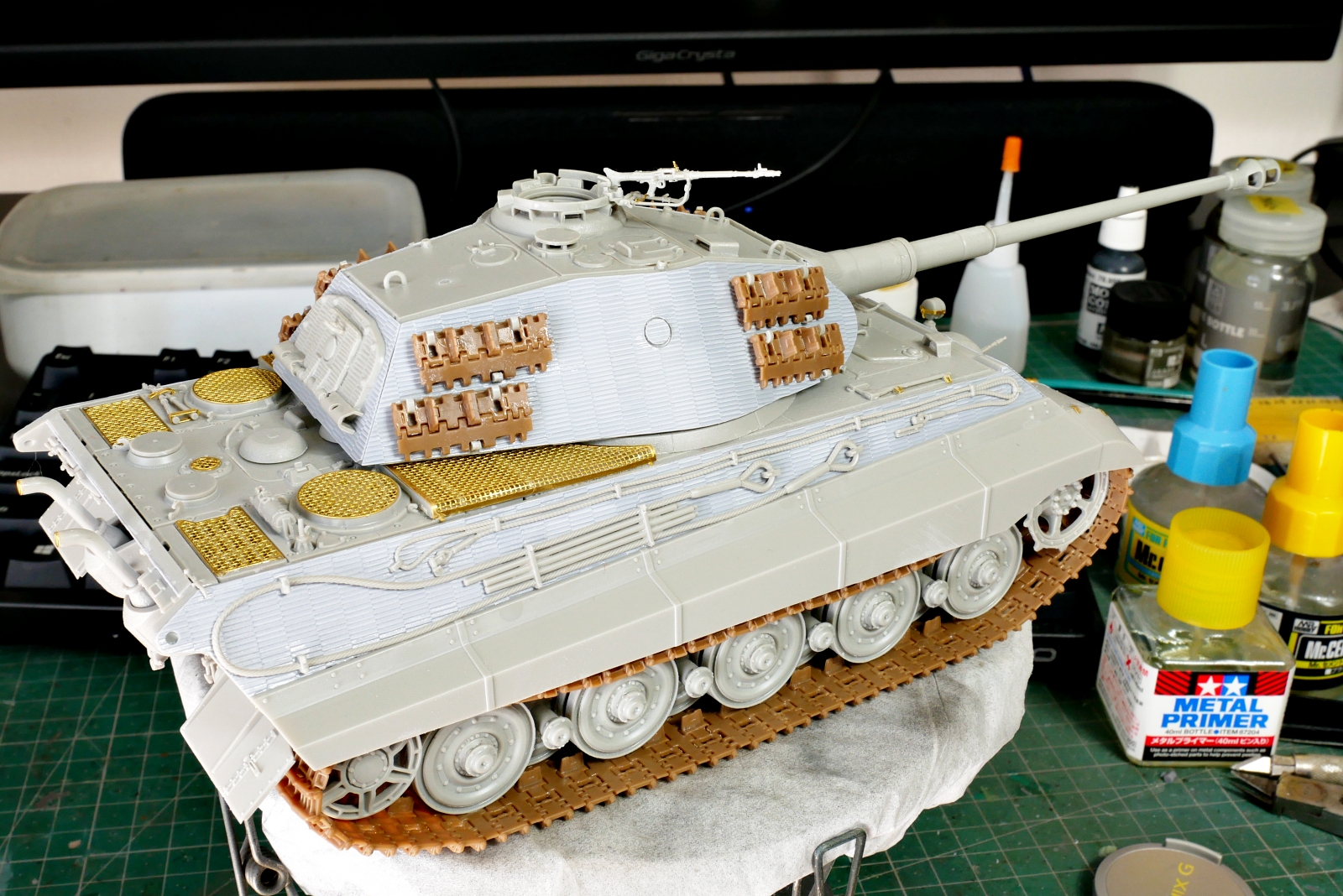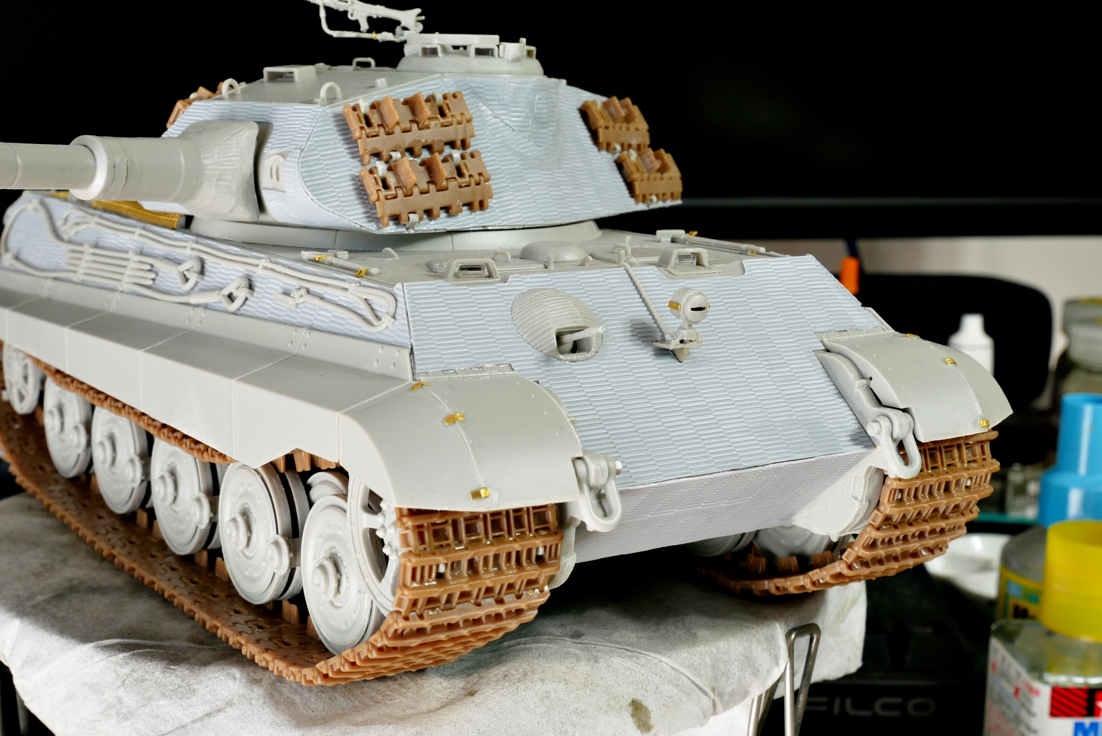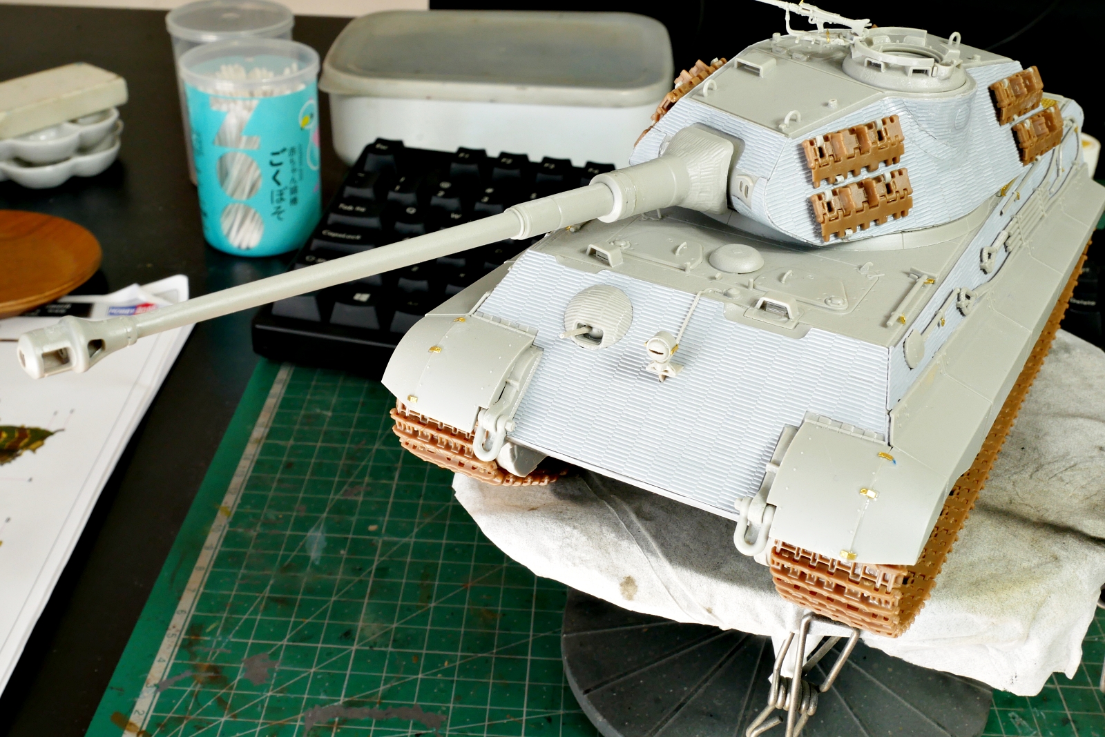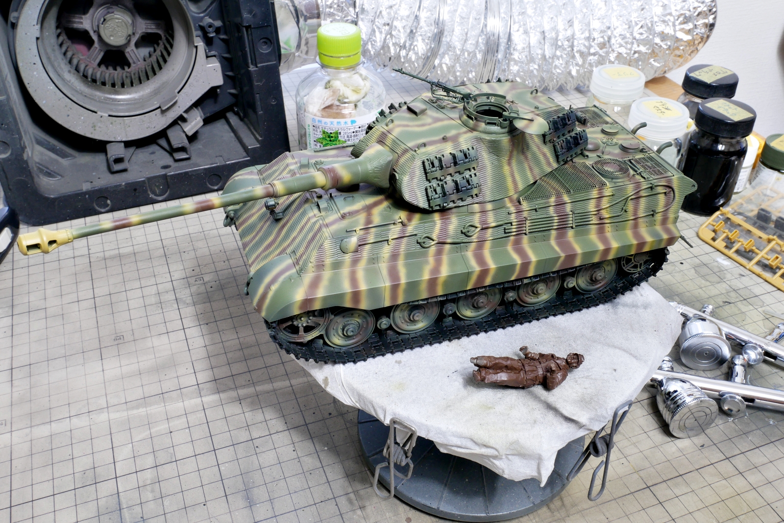 最近はそこまで寒くないのでちょっと塗装作業をしていました。最初にキングタイガーの全体にフラットブラックを吹きました。