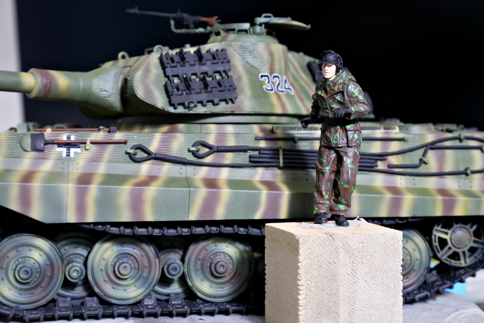 フィギュアもとりあえず塗装しました。迷彩服を着た戦車兵だと大戦末期の雰囲気が出ると思います。あまり細かいパターンで塗れませんでした。なんかダークブラウンとダークグリーンの境目が分かり難かったんですよね、塗っているときは。写真にとったら意外と見分けがつく。照明が暗いのかもしれません。いつもは100WのLED1個くらいの明るさが好きなんだけど、細かい作業するときはちゃんと3個点灯させてデスクスタンドも使ったほうが良かったかも。