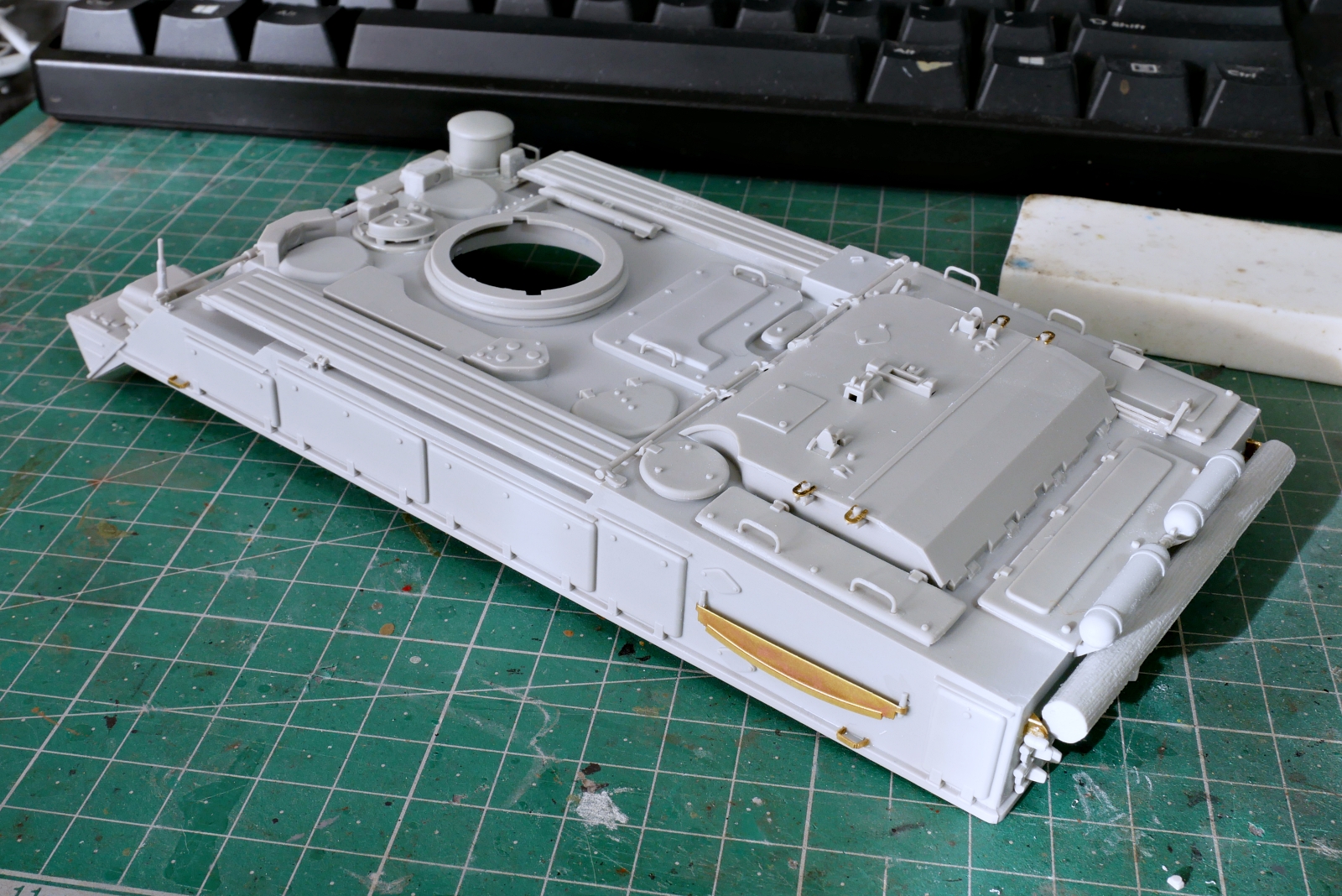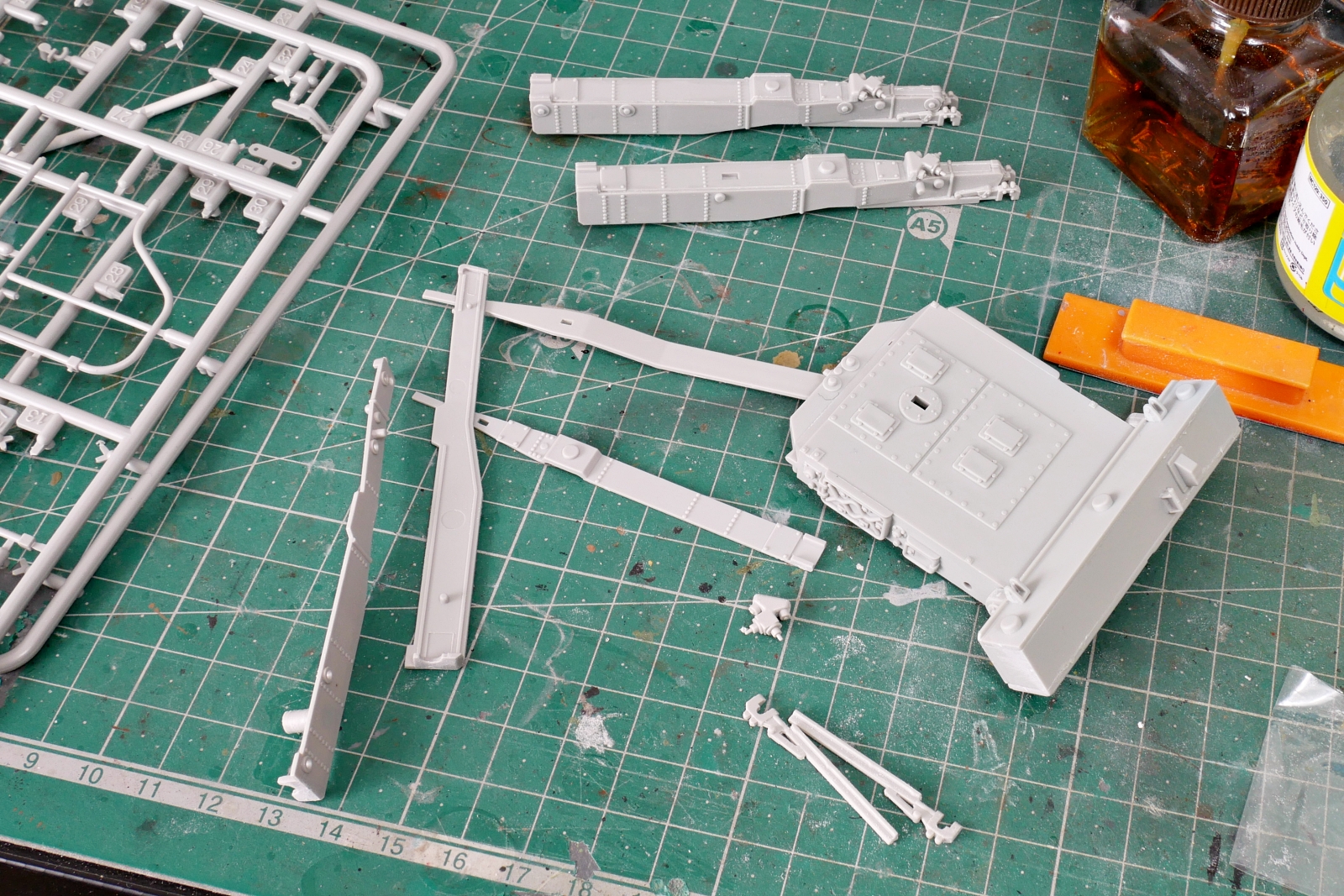 車体の組立です。エッチングパーツは多くないのに、二人で挽くノコギリが金属製だったりと、こだわりがよく解りません。ロシア軍の車両らしいOVMです。車両後部にスタック対処用の丸太も載せましたし。