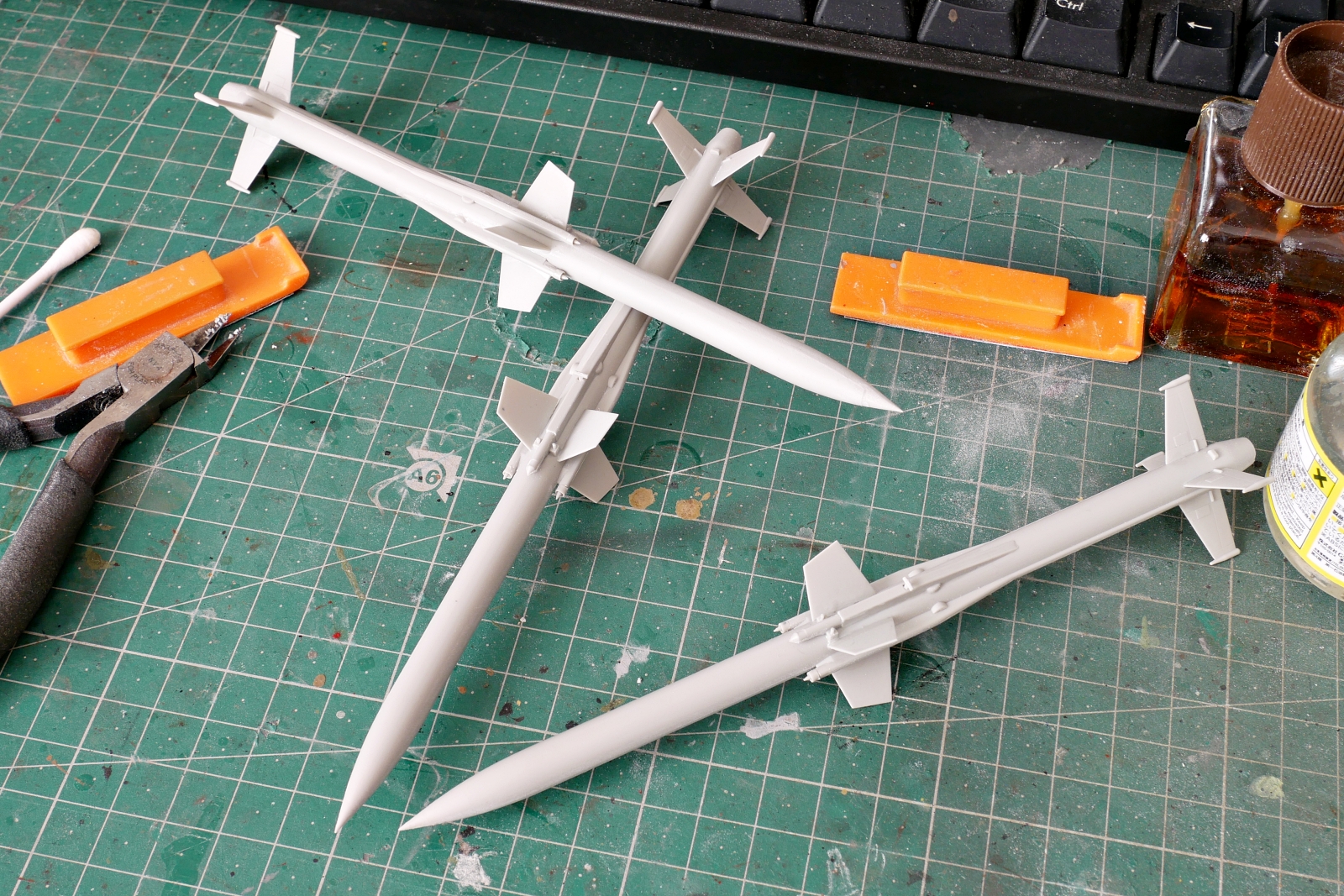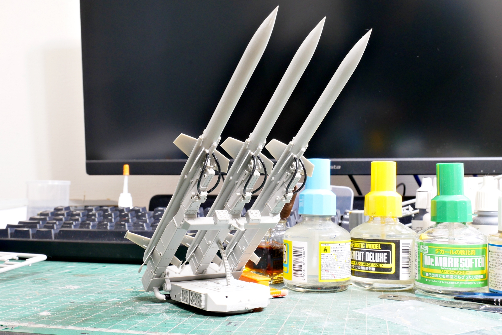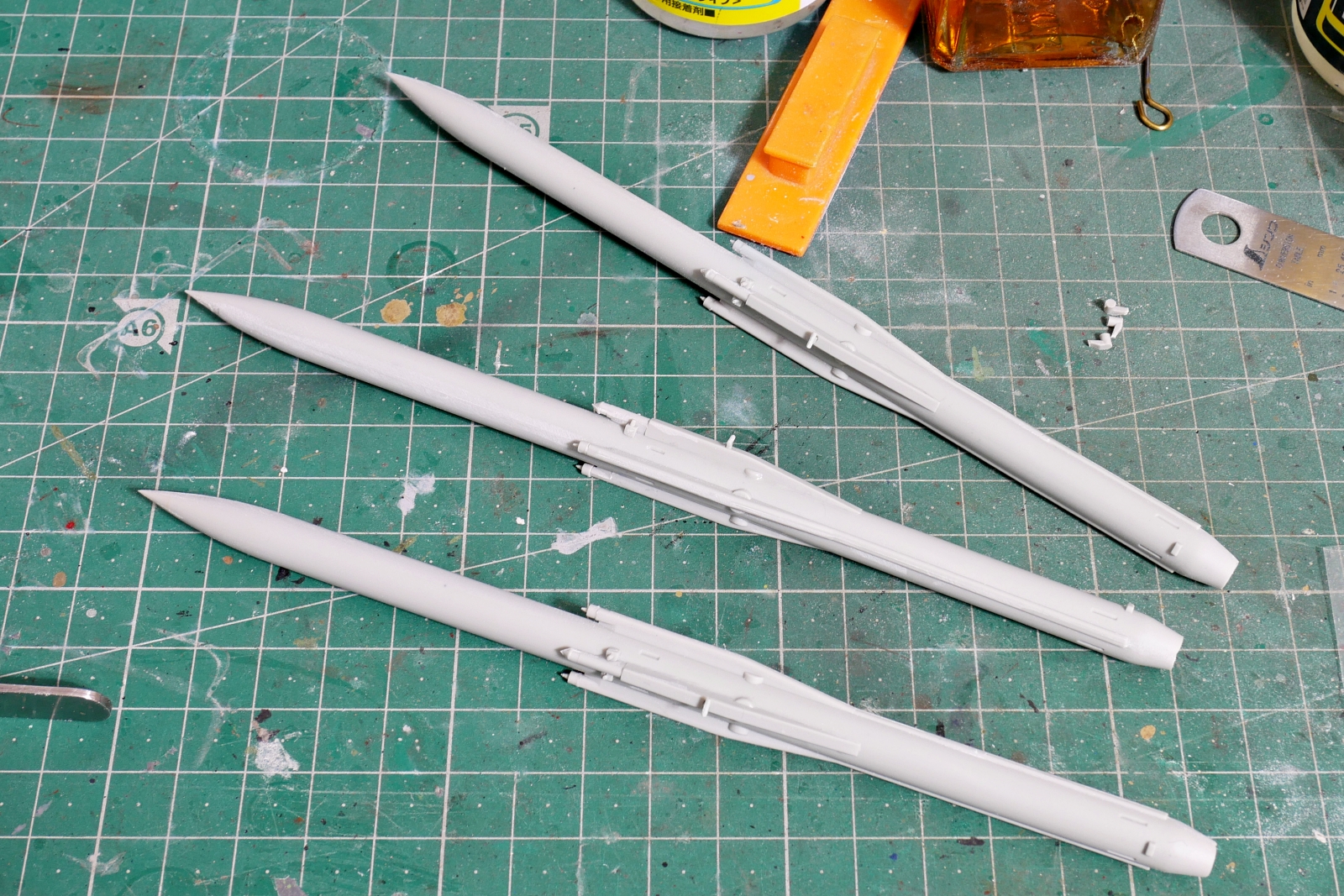 パーツの合わせ目に沿って追加部品を接着する部分もあるにはありますけど、接着剤の乾燥後には結構な面積を綺麗に処理しないといけません。3本の対空ミサイルを組み立てました。けっこうパーティングラインや隙間がありました。隙間は瞬間接着剤で埋めて削ったら簡単に処理できました。この辺の作業はあまりなじみが無いので戸惑うと同時に新鮮で面白いです。