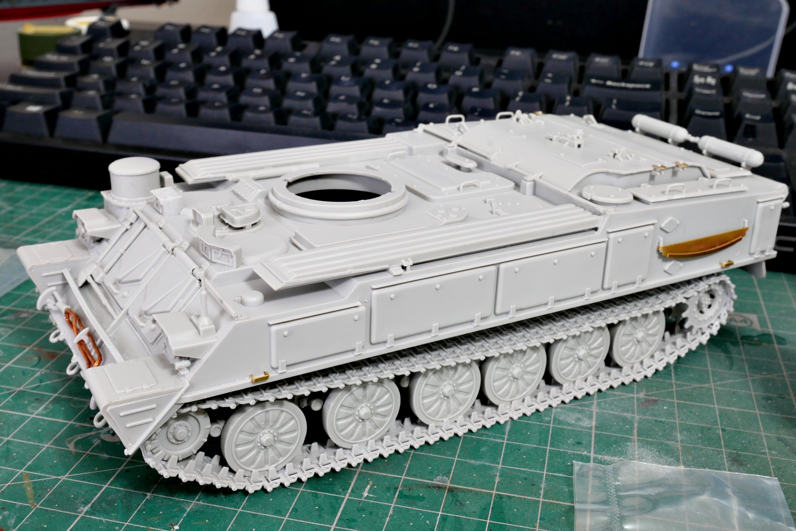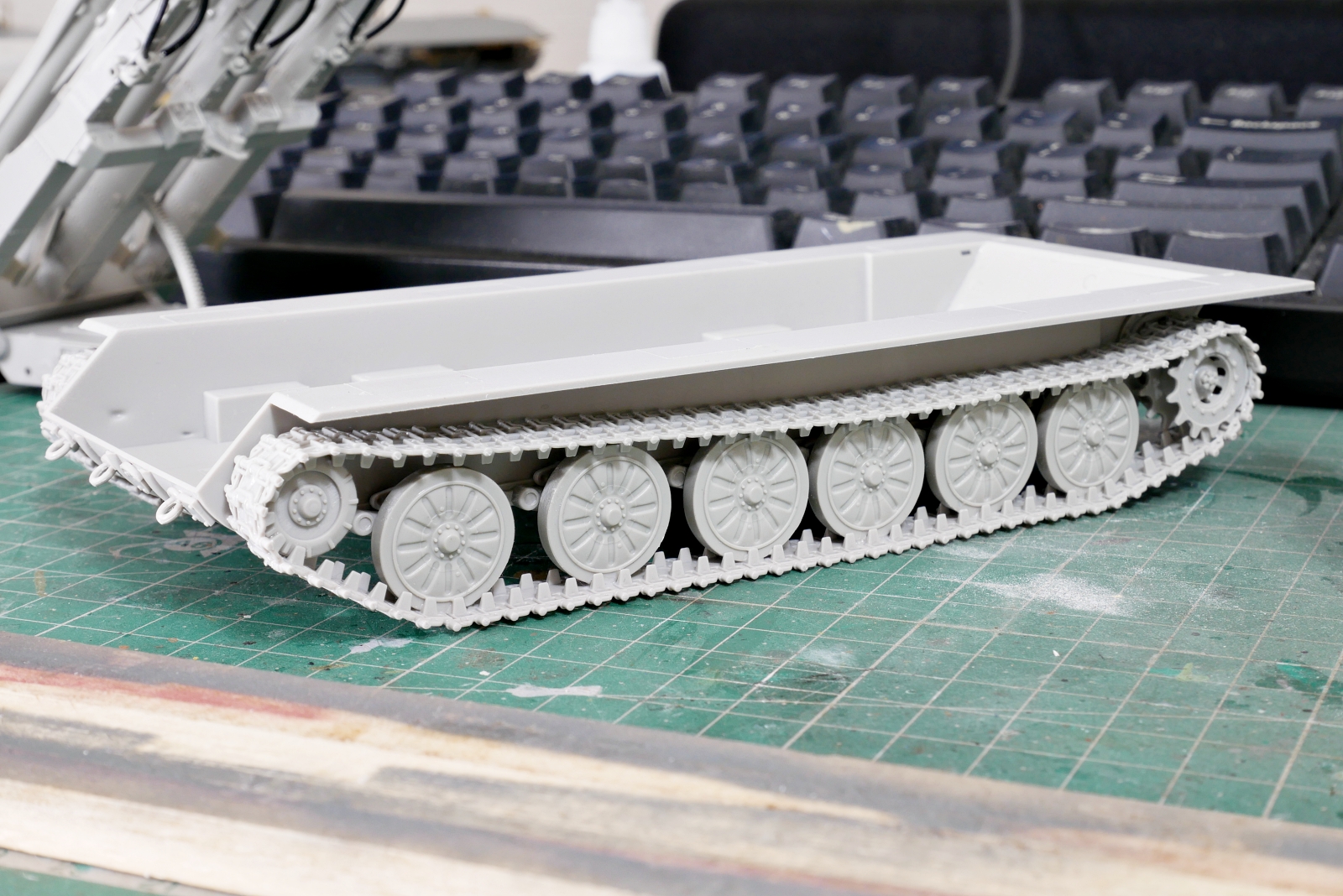 シャーシ側が完成したので、履帯はまだですけど、車体上部の組立作業に入ろうと思います。