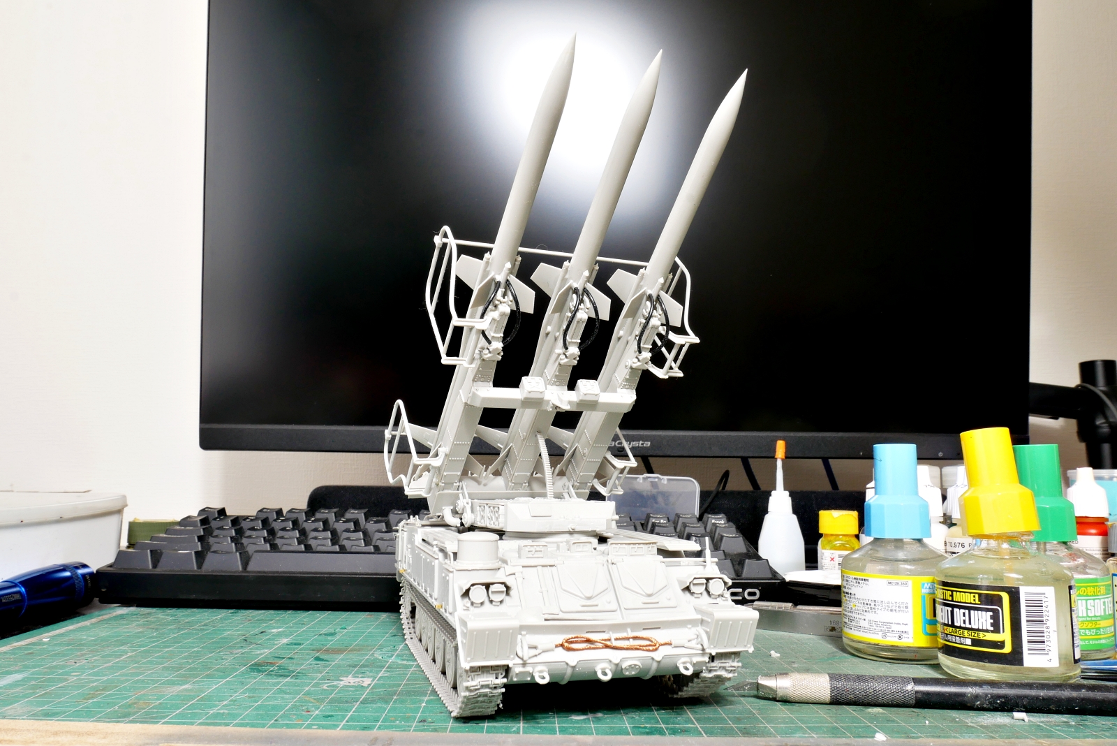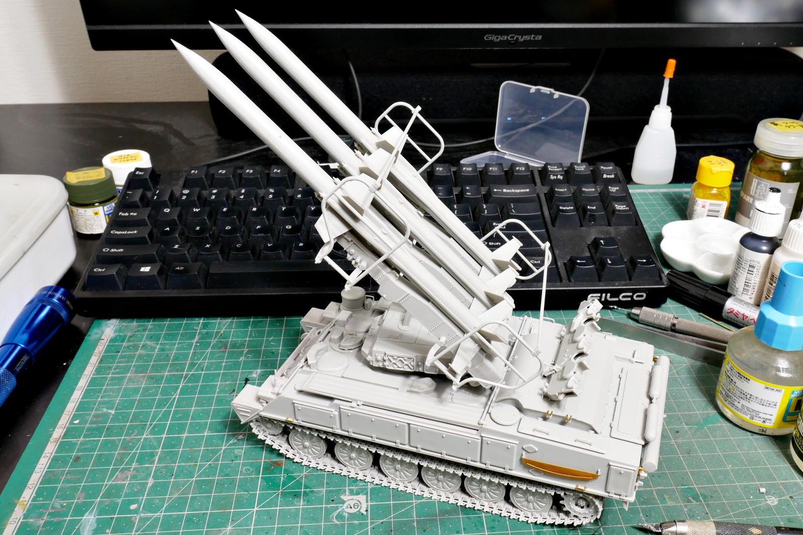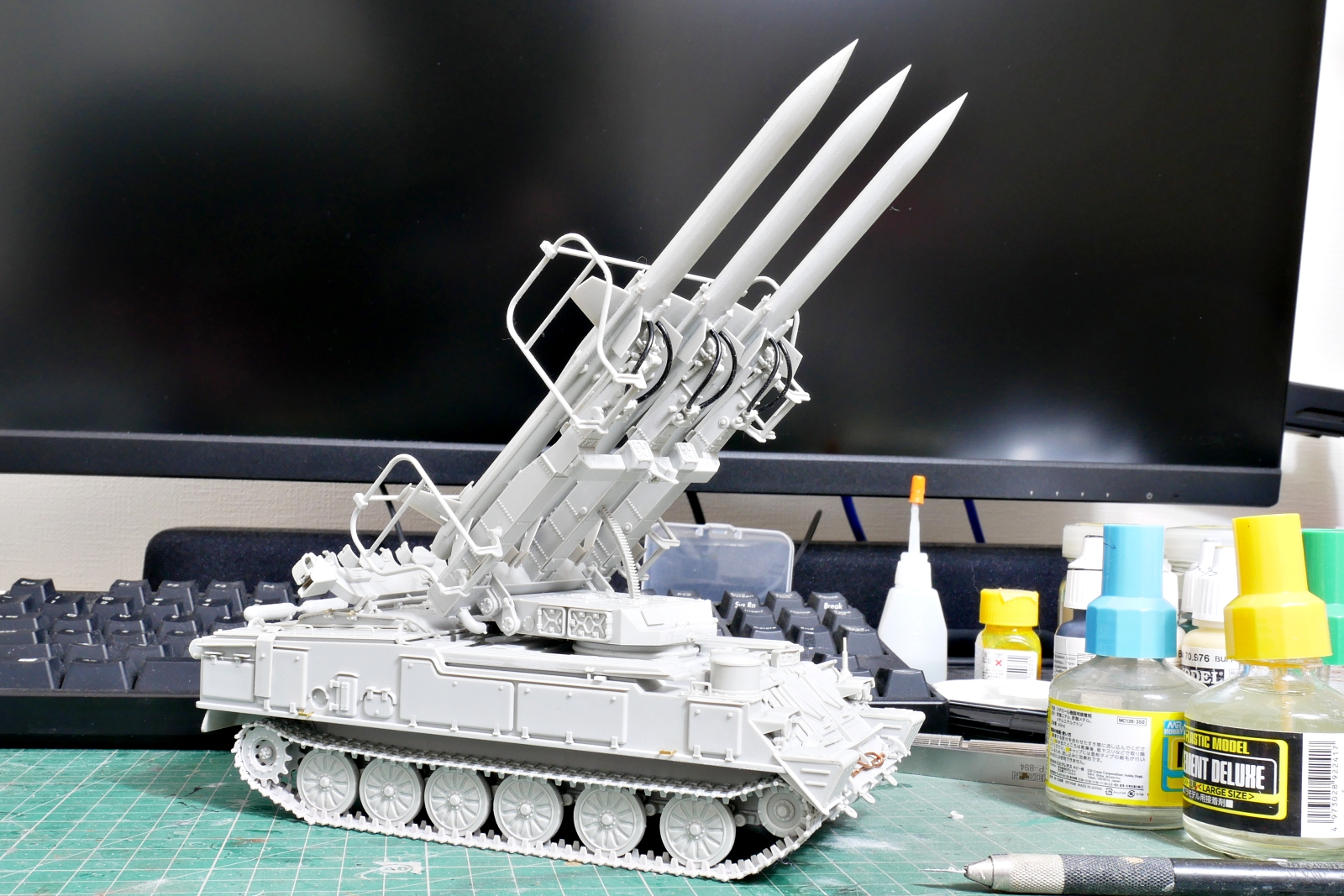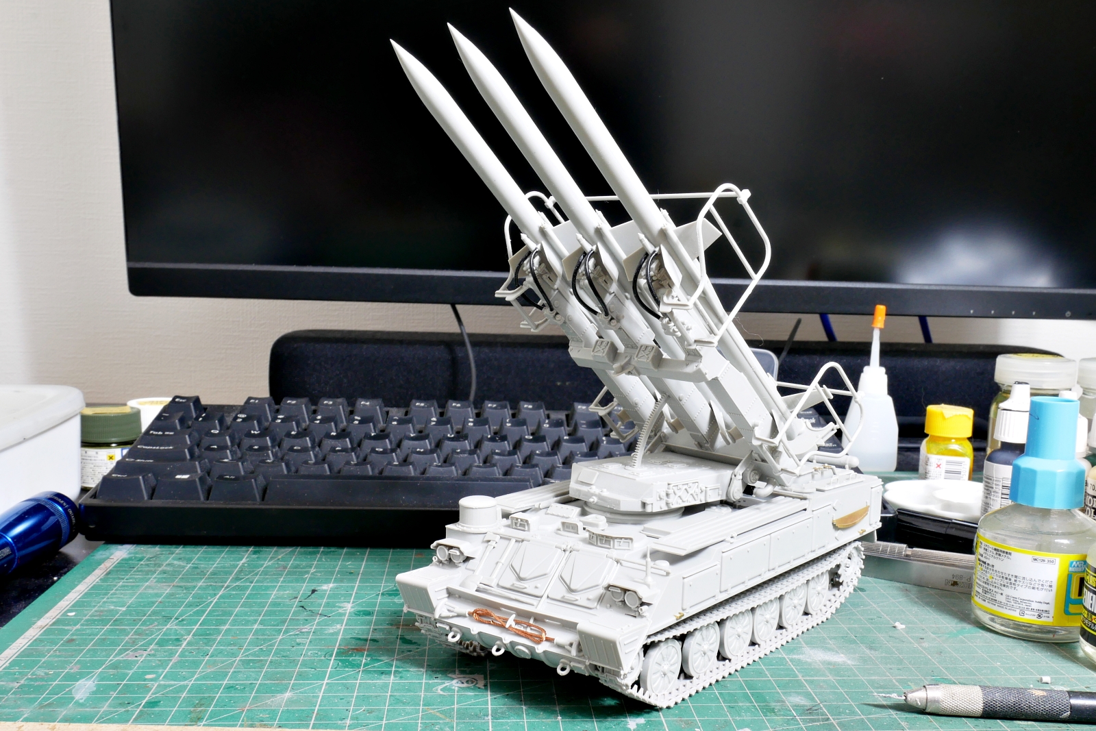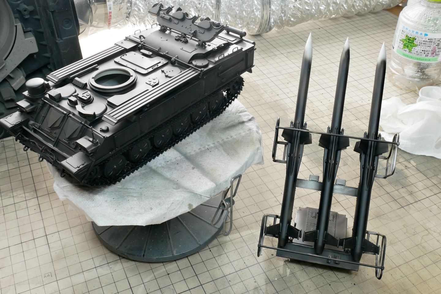 ここのところ短期間ですが少し暖かいのでエアブラシ塗装する気になりました。ちょうど良いタイミングで組立完了していたSAM-6を下塗り塗装しました。自分でグロスブラックにフラットベースを混ぜてつや消しにしたので、つや消し具合がどうかなと思ったのですが大丈夫そうです。定跡通りにフラットベースを2割くらい混ぜました。