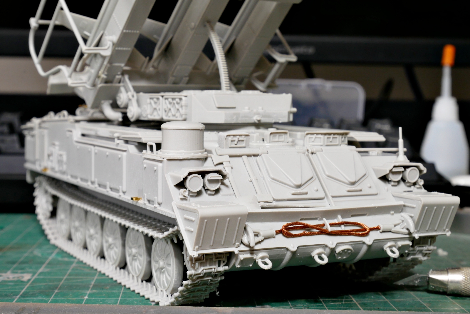 今回の組み立てでやはり慣れていなかったミサイル発射機まわりのディテールが難しかったですね。複雑に重なり合うアームや配線、複雑なパーツがありました。トランペッターのキットは基本そんなに難しくないんだけど、ちょっと面倒に感じる部分もありました。