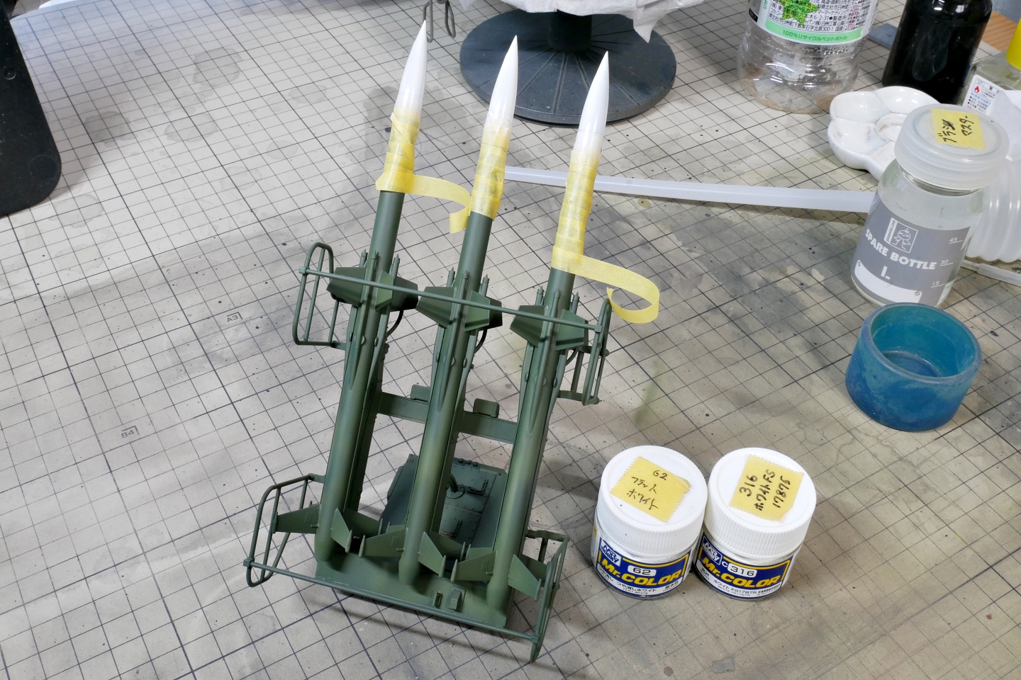 ミサイルの先っちょはホワイトなのでマスキングして塗装しました。一部パーティングラインや隙間埋めが甘かった部分があって、ホワイト塗装中に気が付いてヤスリ掛け等を行っていたので時間が掛かってしまいました。いったん乾いてからじゃないときれいにサンドペーパーを掛けたりできないですからね。とりあえずは綺麗に塗れたと思います。